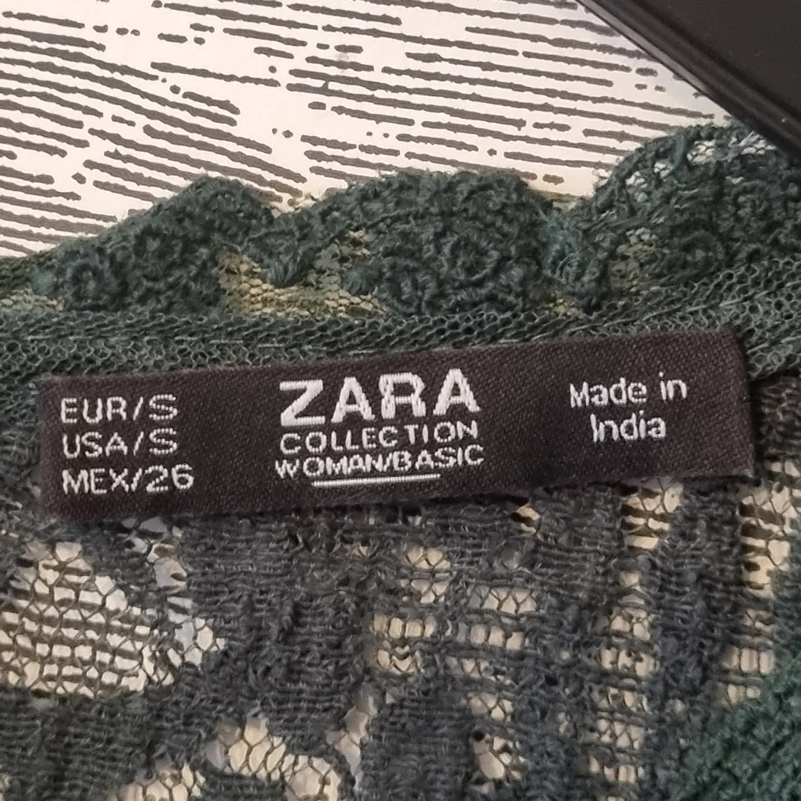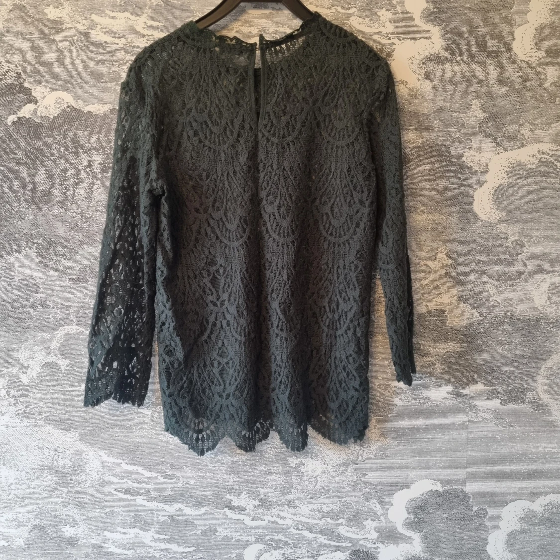 Mörkgrön spetsblus från Zara. Blusen har långa ärmar och ett vackert spetsmönster som ger en stilren look. Blusen är i mycket bra skick. Jag hittar ingenting att anmärka på.