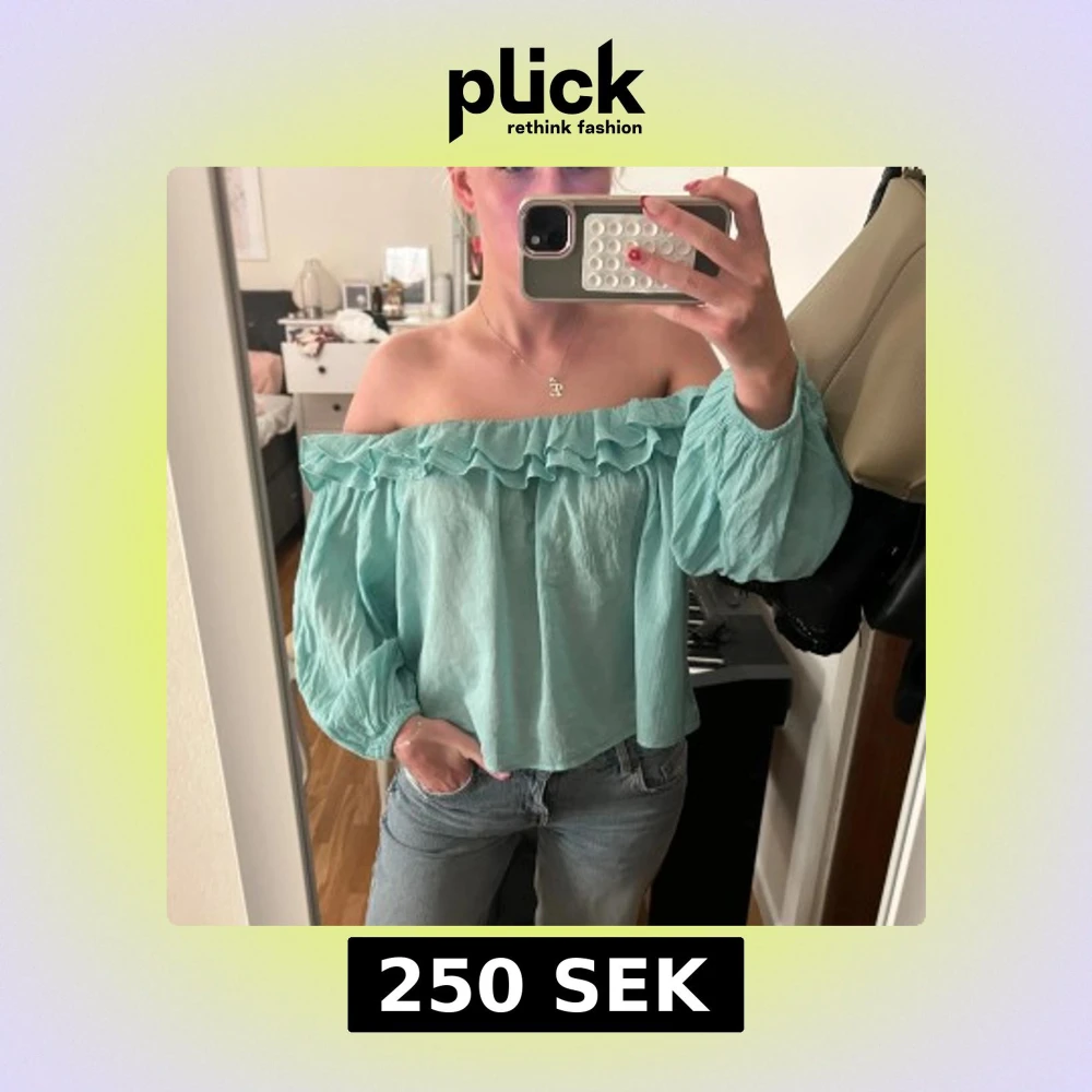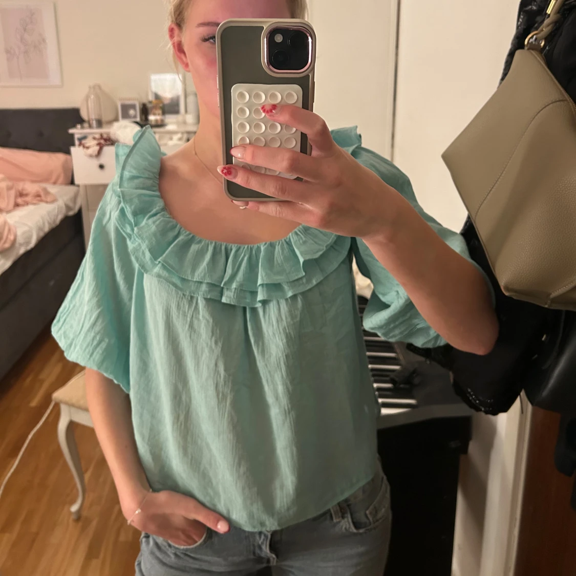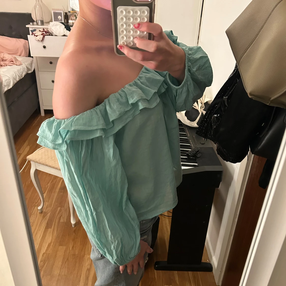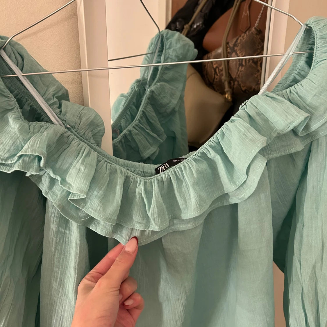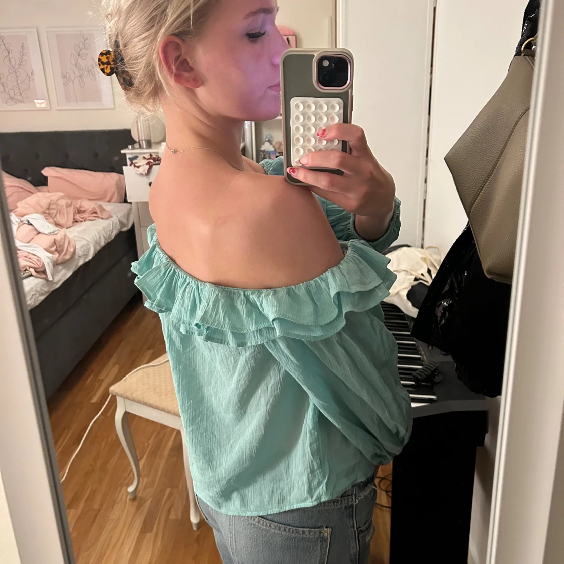 Turkos volang blus från Zara. Passar till allt och går att ha on-shoulder men även off (nedanför axlarna, se på bilder). De är storlek XL men jag som bär S har köpt den för jag tycker den sitter snyggt på mig lite pösigt som på bilderna