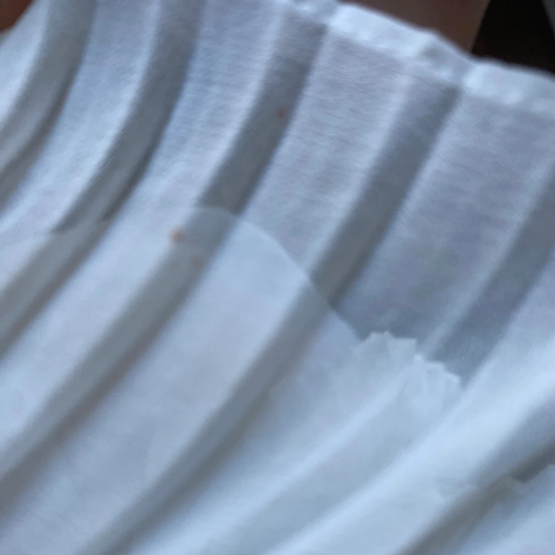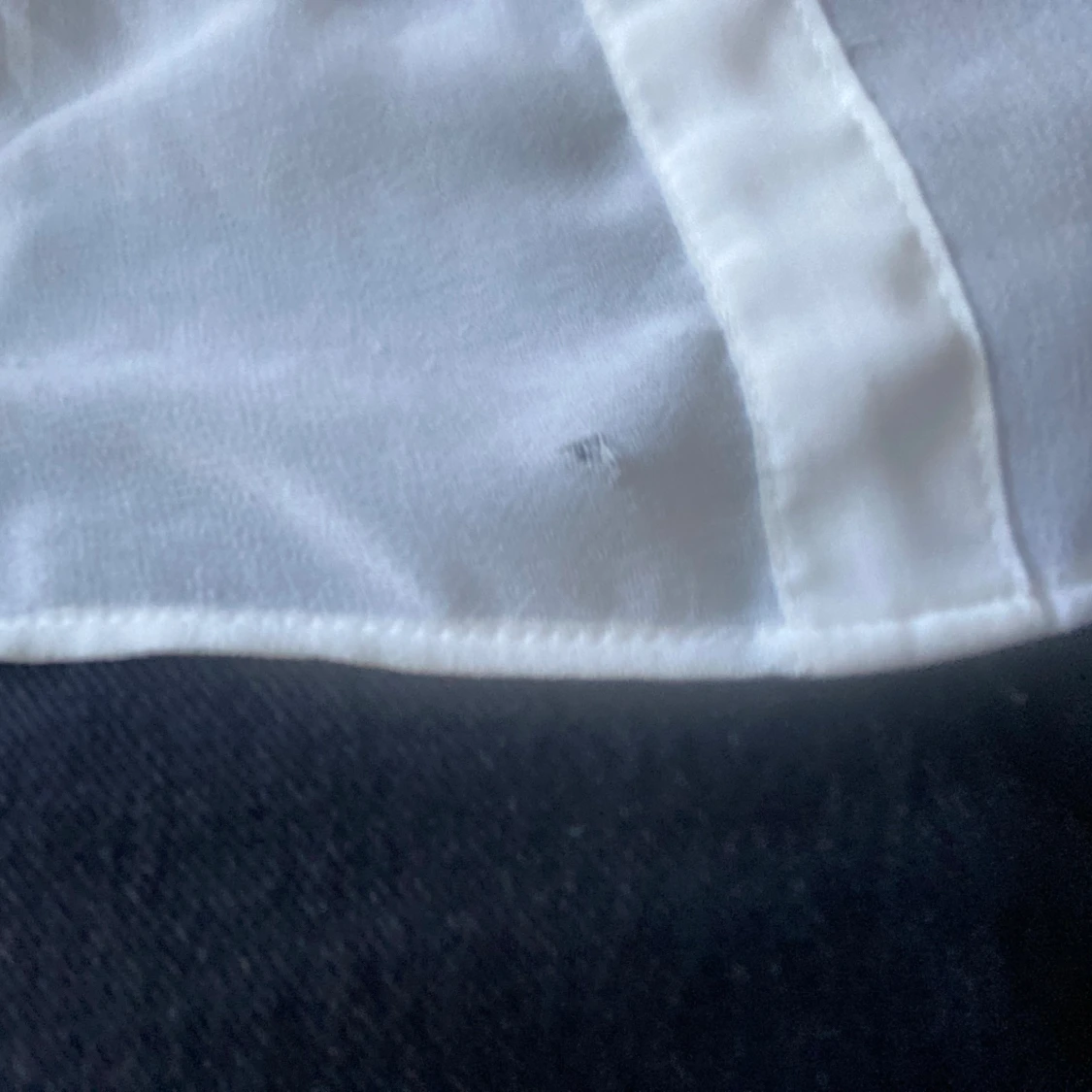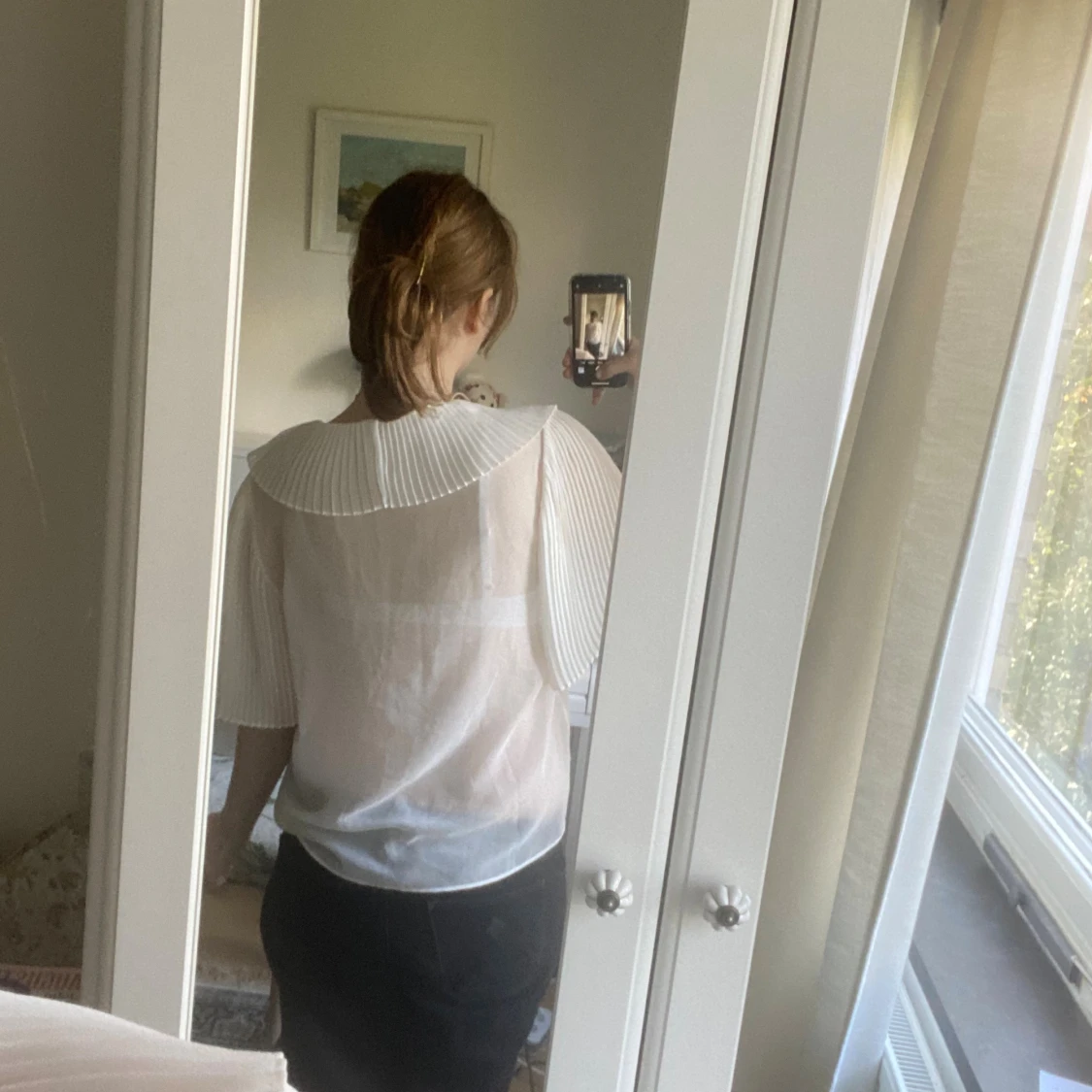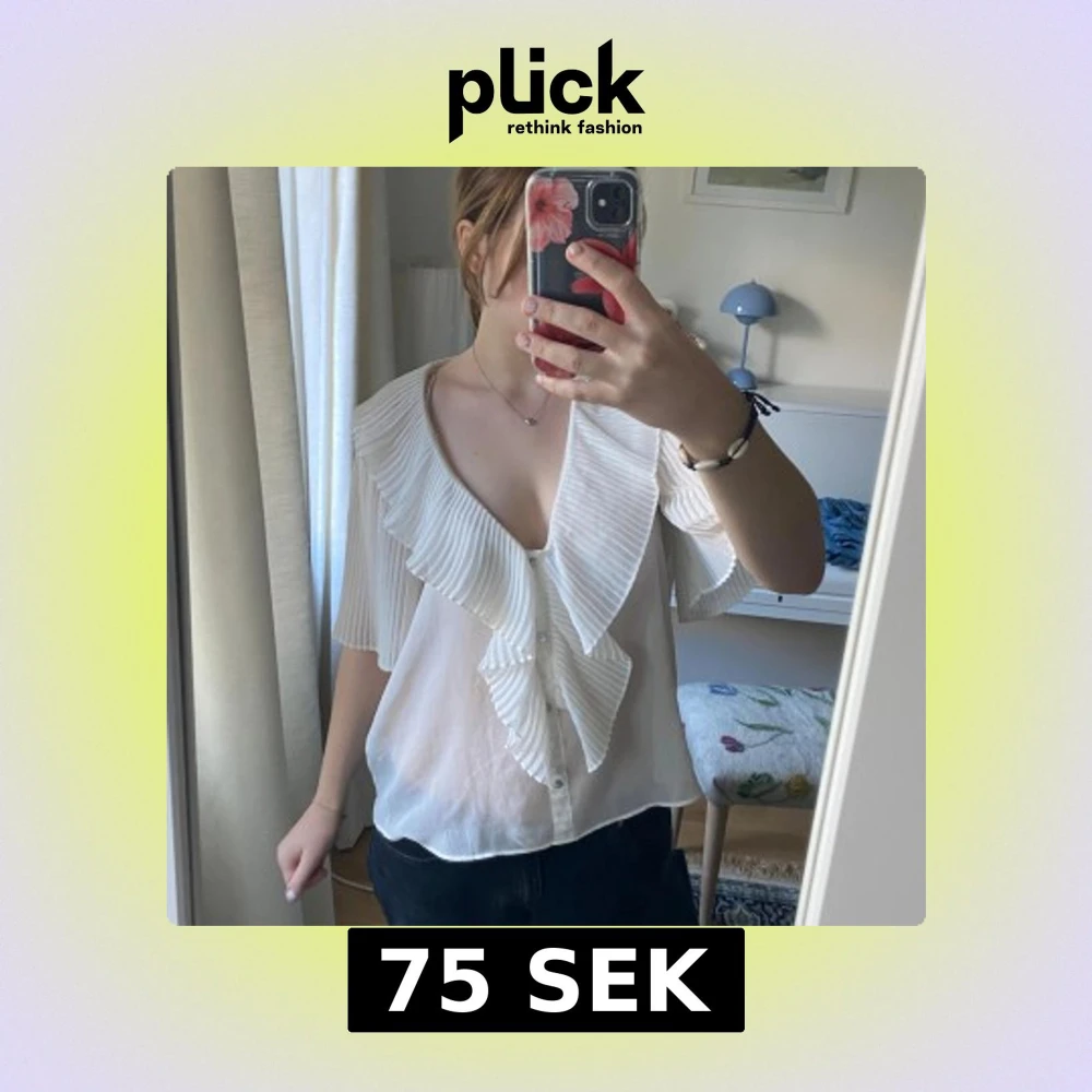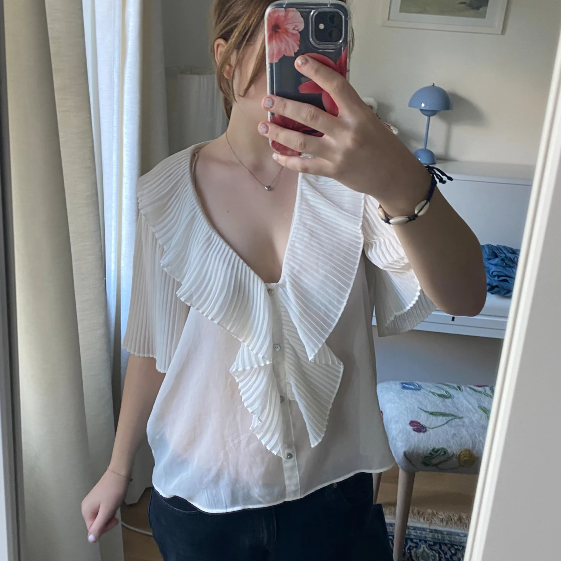 Säljer en genomskinlig luftig vit blus med djup v-ringning, stora plisserade volanger längs kragen och framtill. Knappar framtill och korta ärmar. Tunt, transparent tyg som känns lätt och somrigt. Lite tomatfläclar och ett litet hål men syns inte på avstånd💕