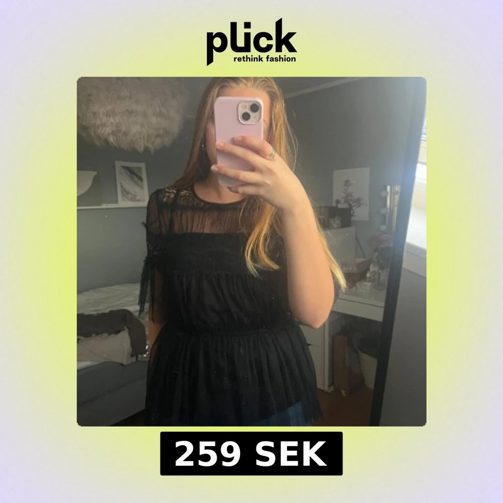 Snygg svart blus med transparenta partier och spetsdetaljer. Blusen har korta ärmar och en luftig passform, perfekt för en stilren look. Den är tillverkad i ett lätt och bekvämt material. Väldigt lik by malina blusen fast denna är från happyholly. Storlek 36/38.