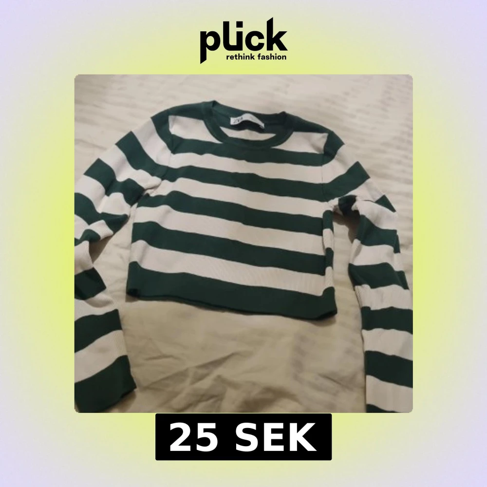Snygg croppad topp från Zara med breda gröna och vita ränder. Modellen har lång ärm och rund halsringning. Materialet är mjuk bomull som känns skönt mot huden. Perfekt för dig som gillar en chill och trendig stil.