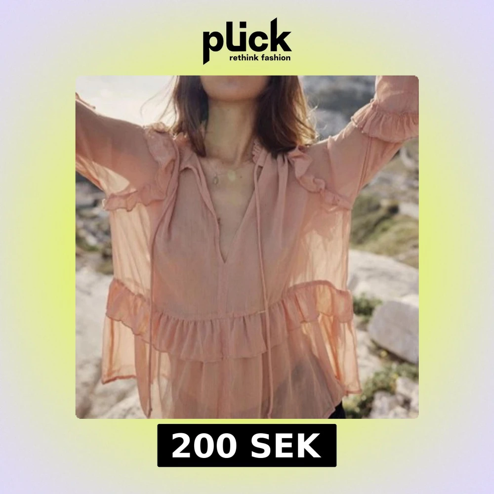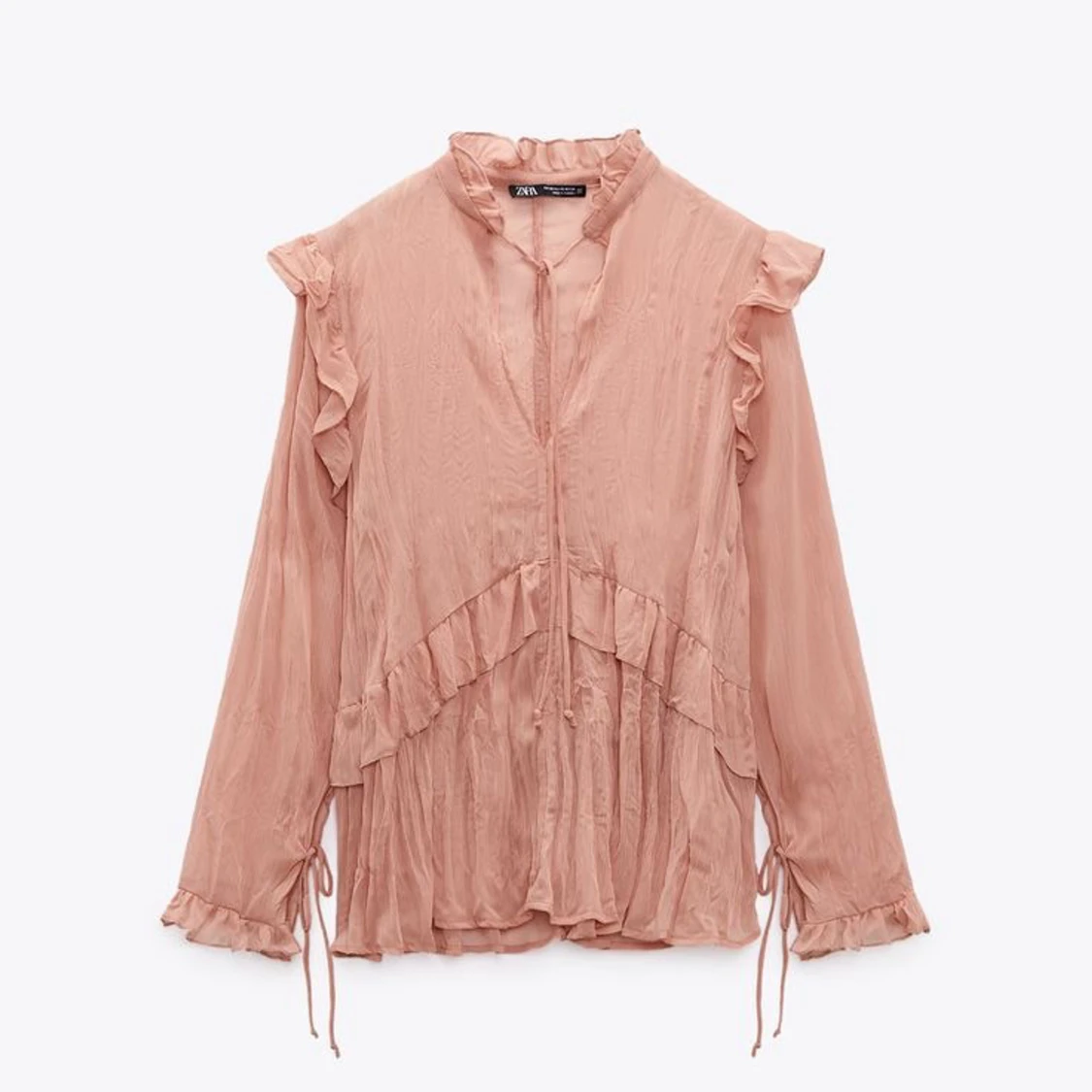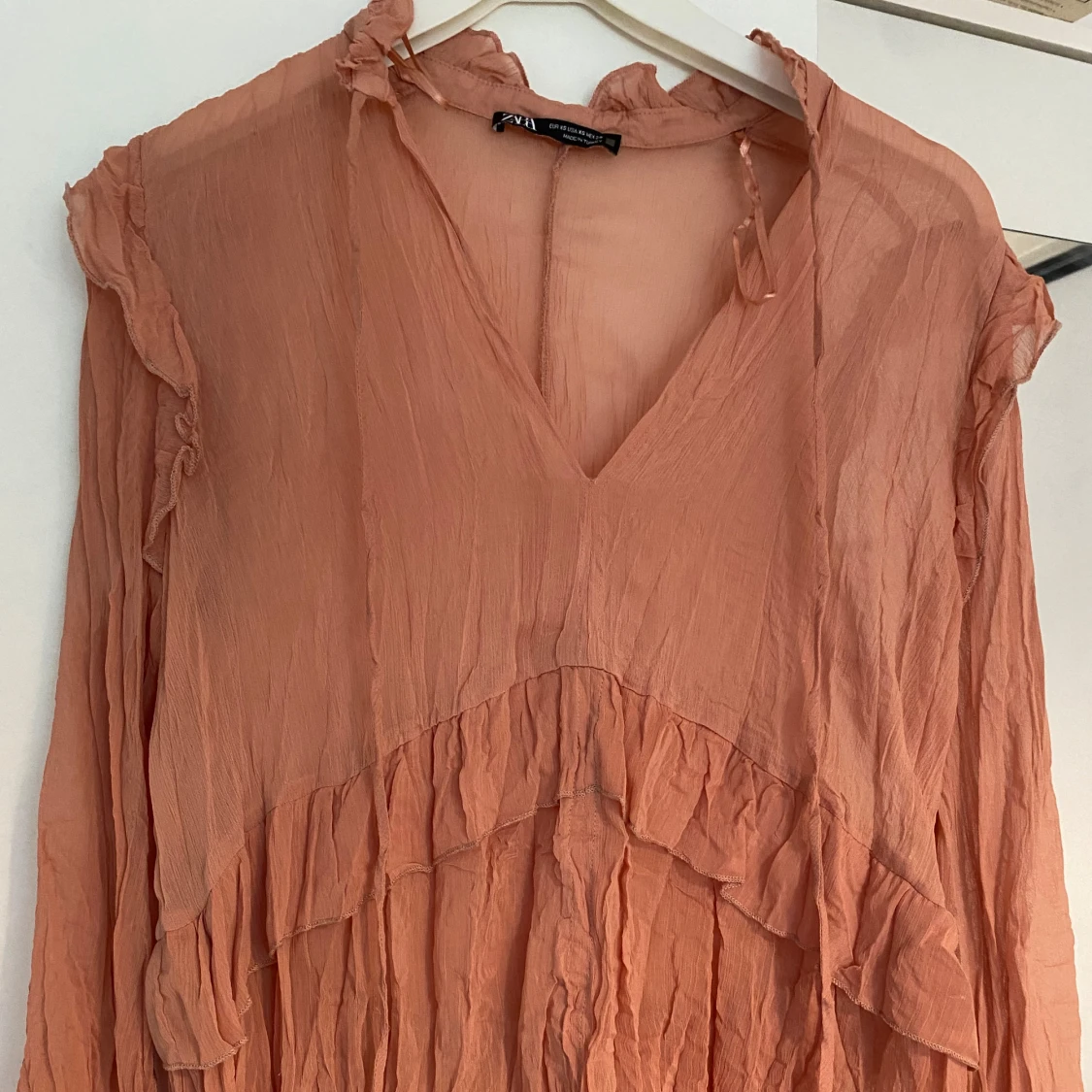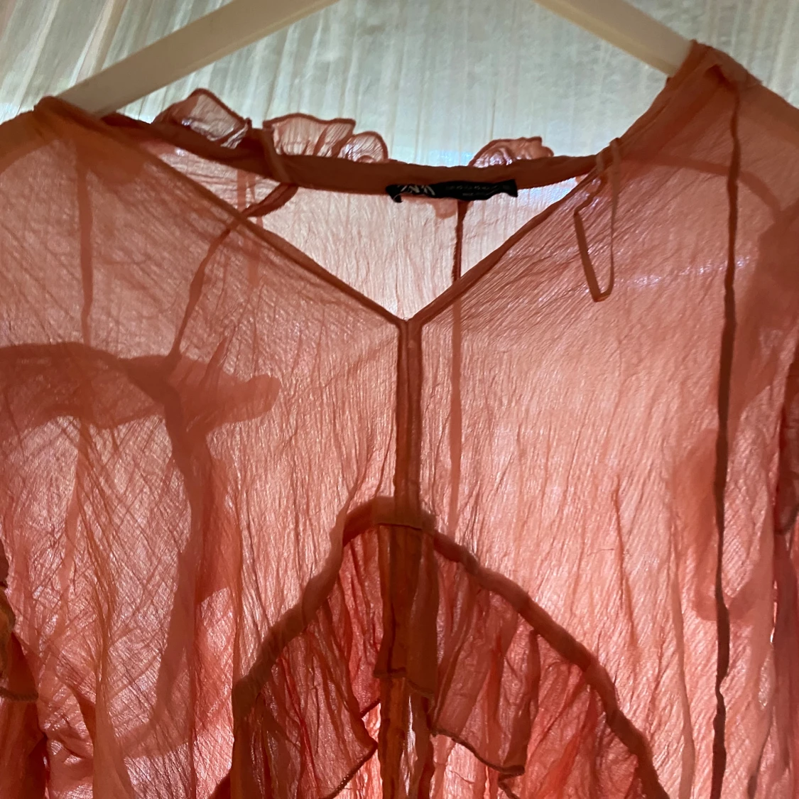 En genomskinligt rosa blus från Zara. Storklek XS . Jag har knappt använt den , för jag trodde färgen skulle vara ljusare. Den har bara legat i min garderob o dammat därav att den ser skrynklig ut. Men det är bara att stryka den.