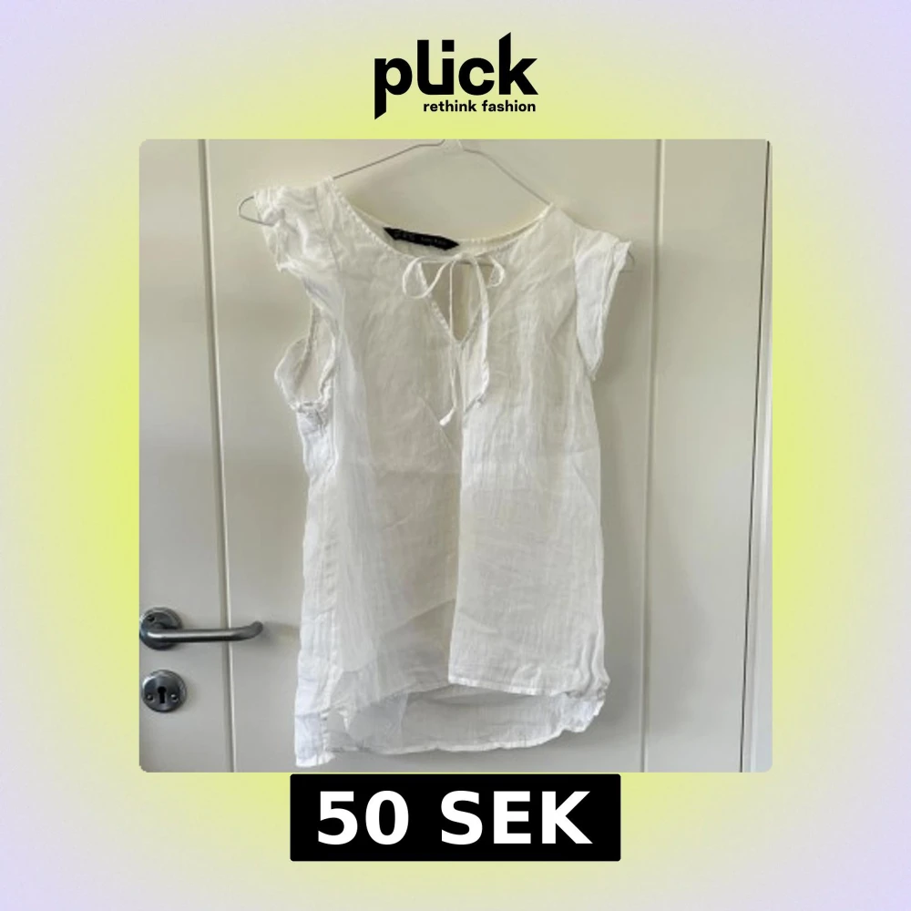 Superfin vit linnetopp från Zara Basic i storlek XS. Toppen har ärmlös design med volangdetaljer på axlarna och en söt knytning vid halsen. 🤍 Använd få gånger, i fint skick. Säljs på grund av att den inte passar längre🤍