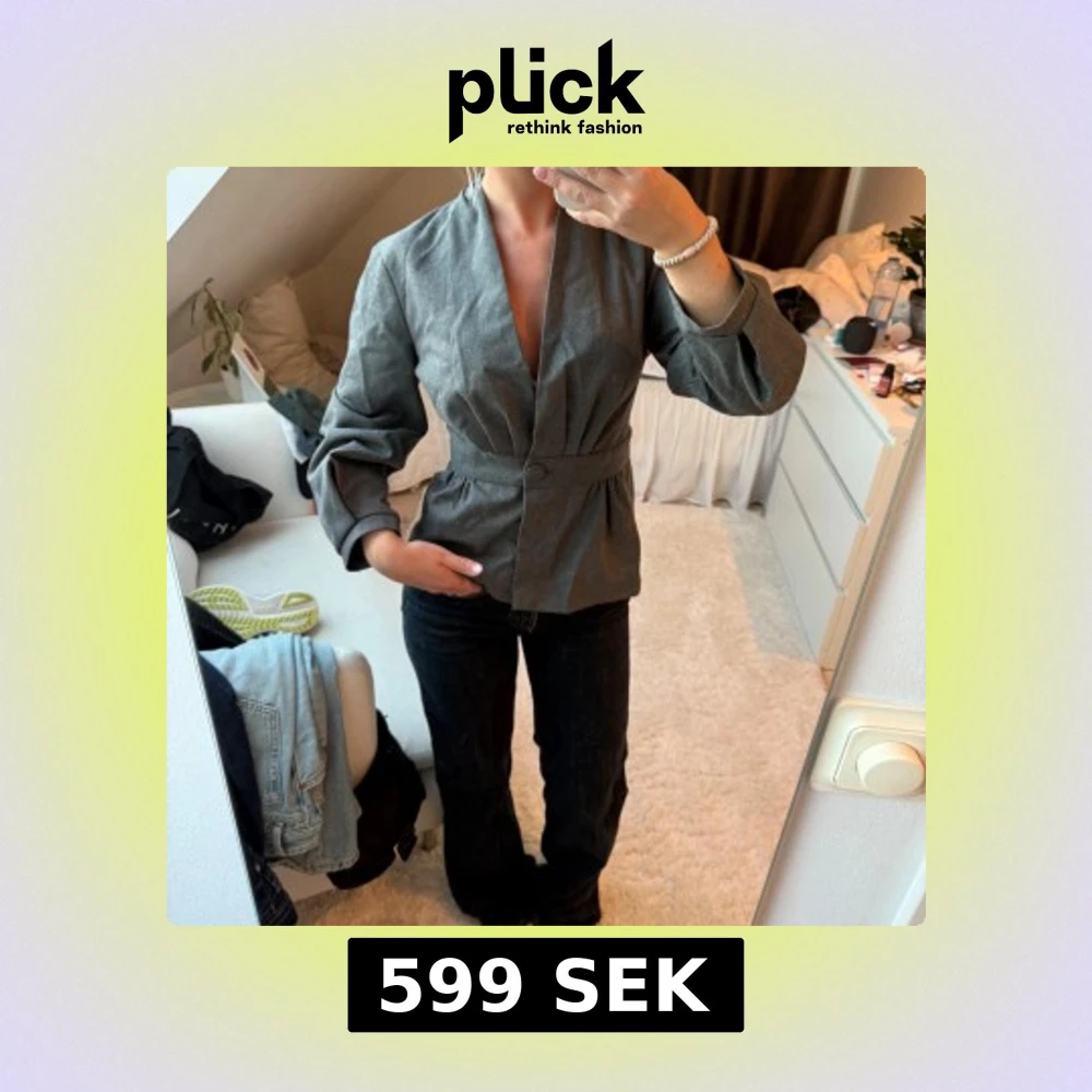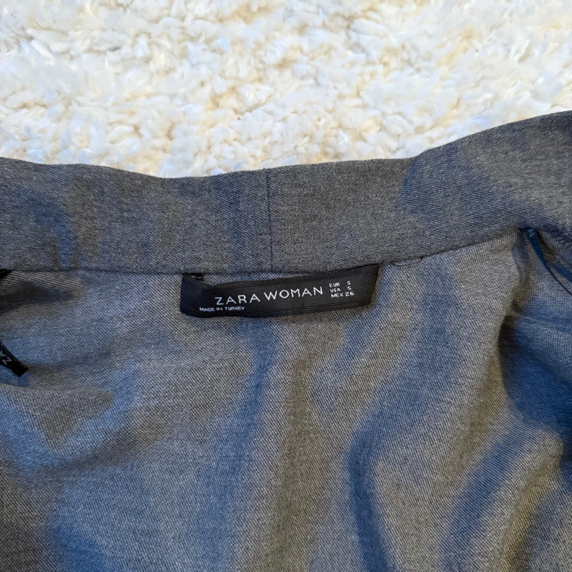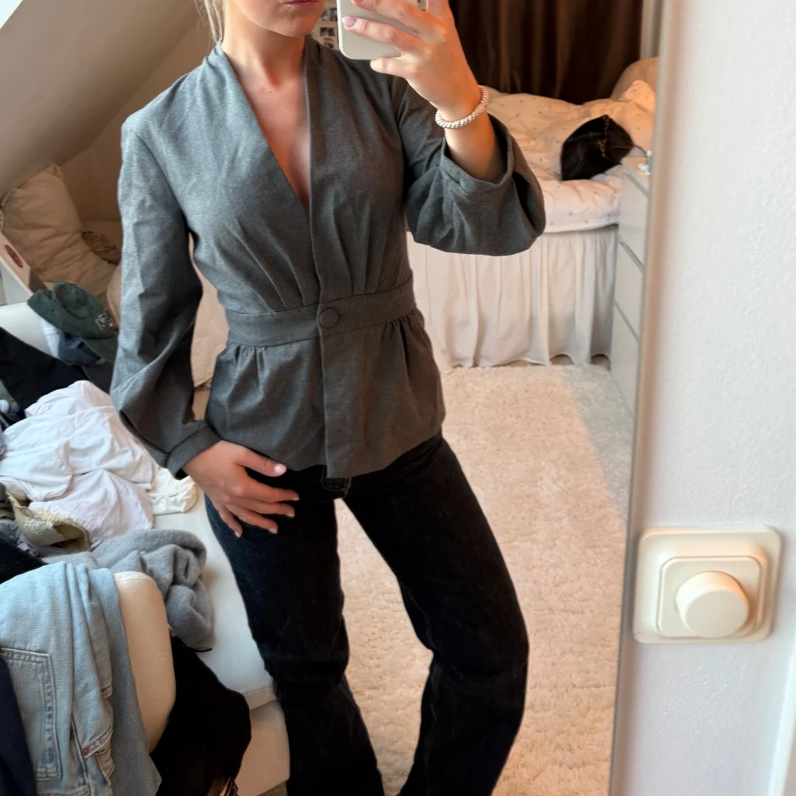 Säljer en stilren grå blus från Zara Woman med markerad midja och knäppning framtill. Använd fåtal gånger.