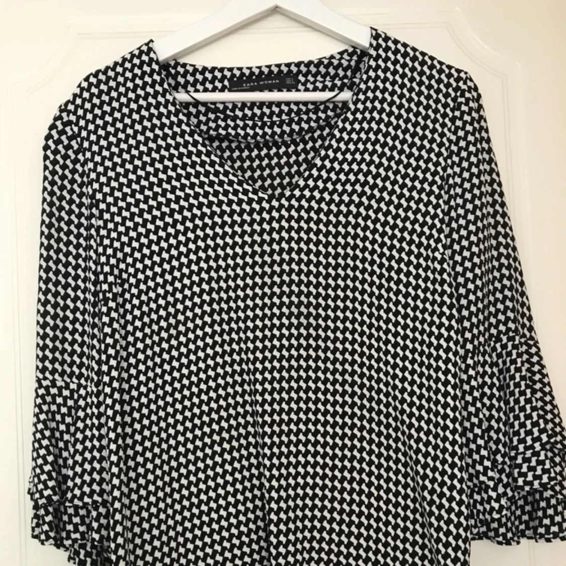Mönstrad blus från zara med fina detaljer och volanger. Säljer pga av att jag aldrig använt den Köparen står för önskad frakt