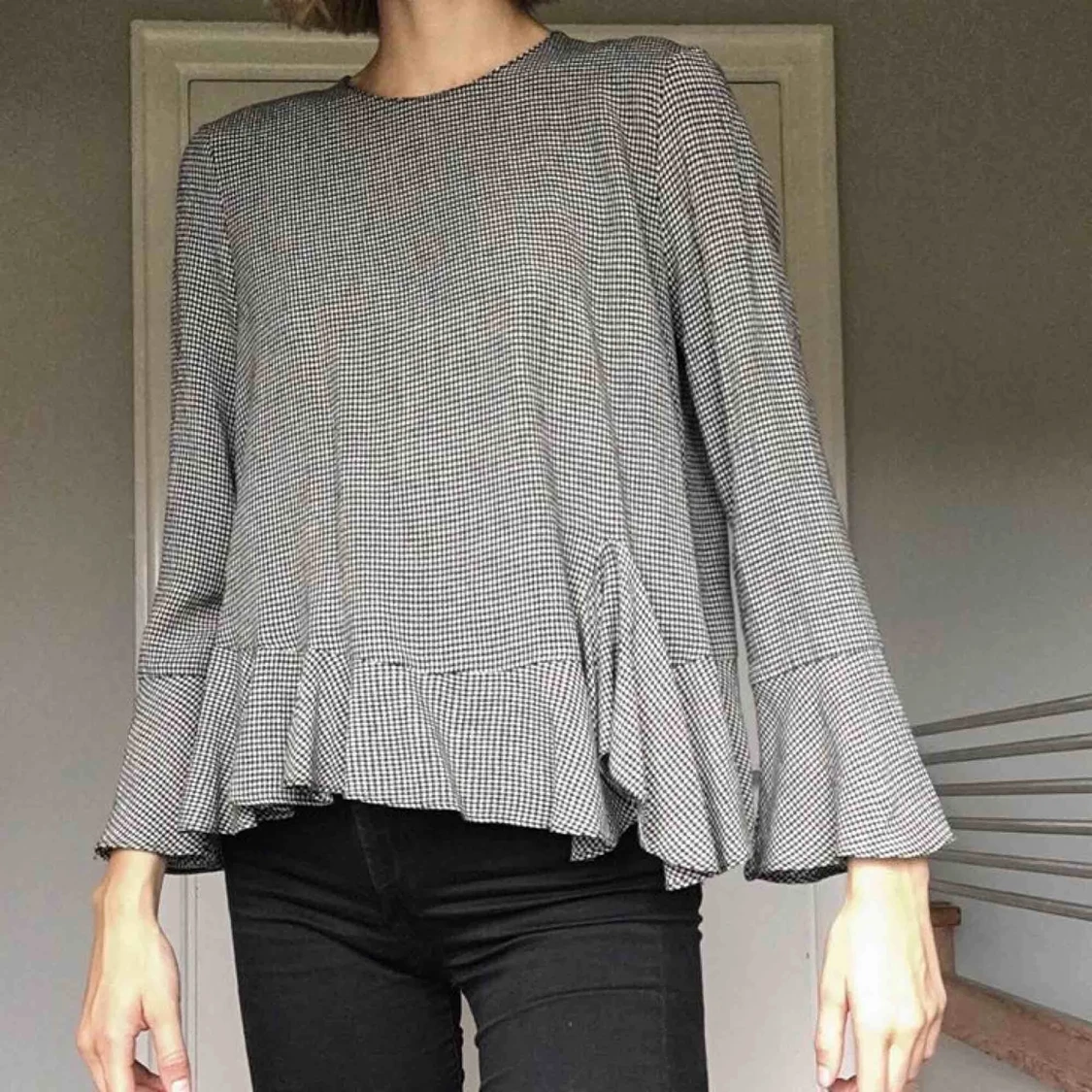 Snygg blus med volanger från Zara. Är i gott skick då den knappt blivit använd. Kan möta upp i Kristianstad eller Lund, annars står köparen för frakt.