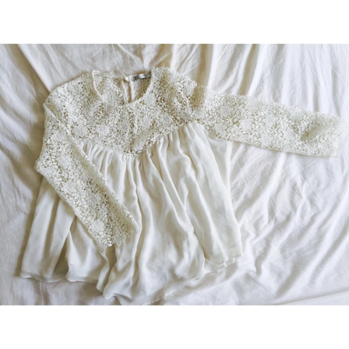 Vit blus från zara med spetsdetalj. Använd några gånger men i fint skick. Storlek medium. Passar en small också. Skickas eller möts i Stockholm.