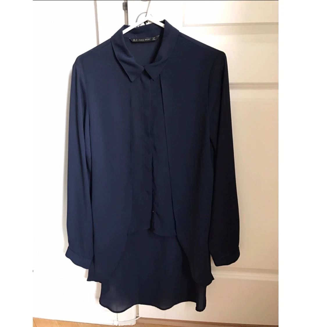 Mörkblå volang blouse från Zara i fin skick. Säljes pga fel storlek. Storlek M