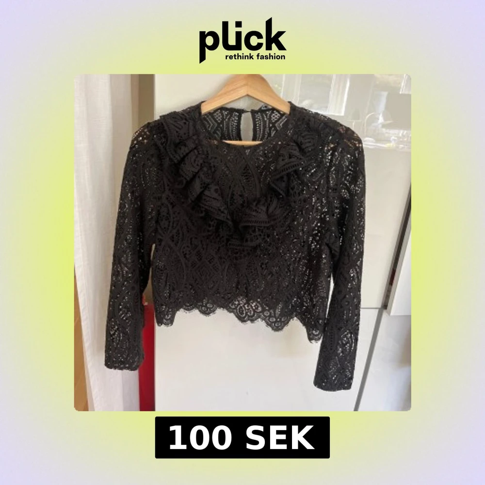 Supersnygg svart blus i spets med lång ärm och detaljerad volang framtill. Blusen har ett unikt mönster och är croppad med vågig kant nedtill. Perfekt för dig som gillar statement-plagg och vill sticka ut med coola detaljer. Plagget är ifrån Zara i stl M, men funkar för Xs och S