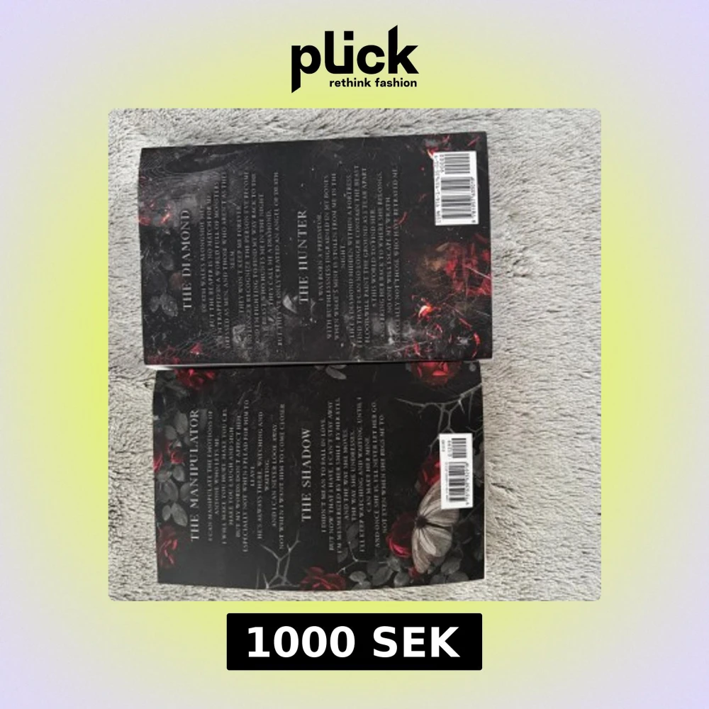 Två böcker med mörka, mystiska omslag prydda av rosor, fjärilar och dödskallar. Perfekt för dig som gillar spänning, skräck och romantik med en gotisk twist. Passar unga vuxna som söker intensiva berättelser och nervkittlande läsning. Köpta från bokaffären, bra skick, 590kr var. Säljer därför för 1000kr.