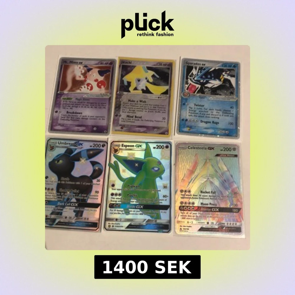 Samling av sex Pokémon GX och EX-kort, inklusive populära karaktärer som Umbreon, Espeon, Mr. Mime, Jirachi, Gyarados och Celesteela. Perfekt för dig som älskar Pokémon och vill utöka din samling med coola och sällsynta kort!