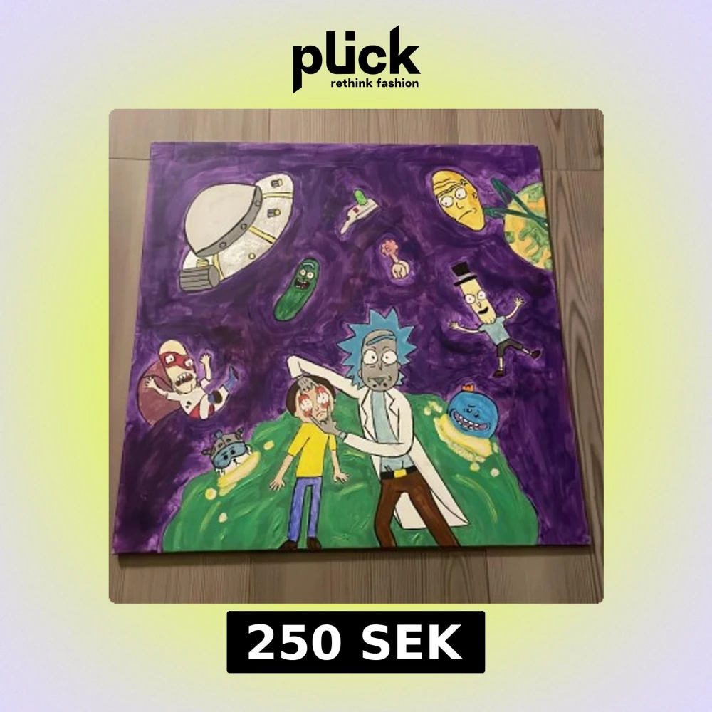Denna bild föreställer en handmålad tavla med motiv från TV-serien Rick and Morty. Flera karaktärer och element från serien syns mot en lila bakgrund. Tavlan är färgglad och unik, perfekt för fans av serien. Inga synliga defekter eller skador på målningen.