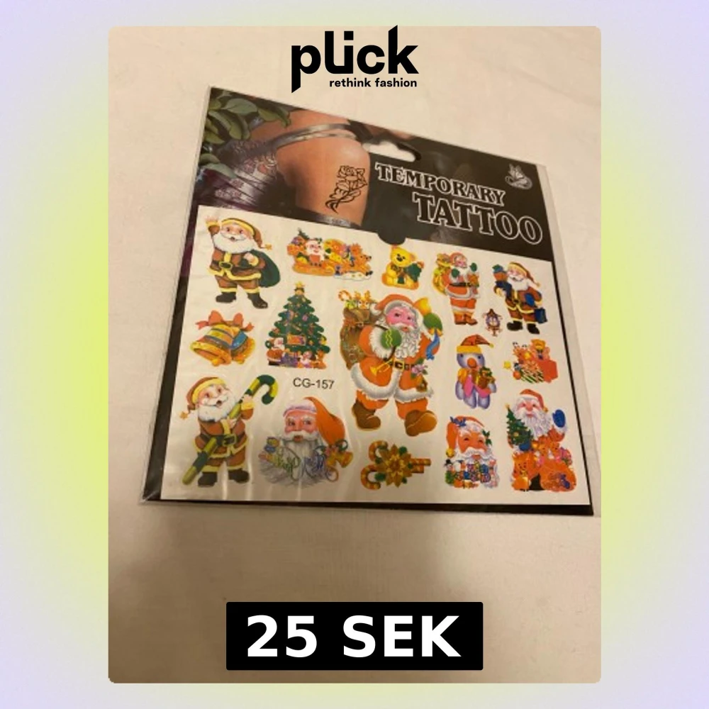 Säljer ett ark med färgglada temporära tatueringar med julmotiv som tomtar, julgran, presenter, björn och polkagris. Perfekt för att piffa upp din look med roliga och festliga motiv. Tatueringarna är i plastmaterial och appliceras enkelt på huden med vatten.