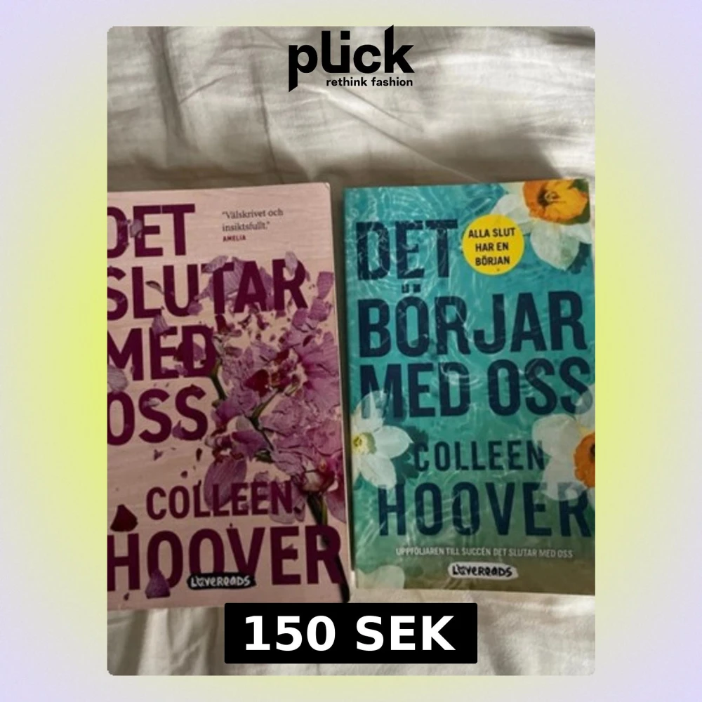 Två skönlitterära romaner av Colleen Hoover: 'Det slutar med oss' med rosa omslag och blommotiv samt 'Det börjar med oss' med turkost omslag och vita blommor. Båda böckerna är tryckta i mjukpärm och utgivna av Lovereads.
