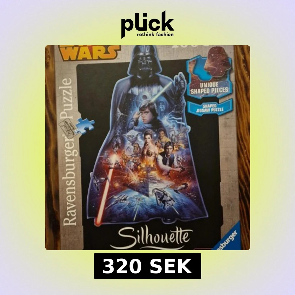 Star Wars 1000-bitars pussel från Ravensburger med unika siluettformade bitar. Motivet visar Darth Vader och klassiska karaktärer. Komplett med en kartong i mycket bra skick, perfekt för samlare och fans. Pusslet är svårt att få tag på och därför en perfekt present eller julklapp för den som gillar pussel och star wars!