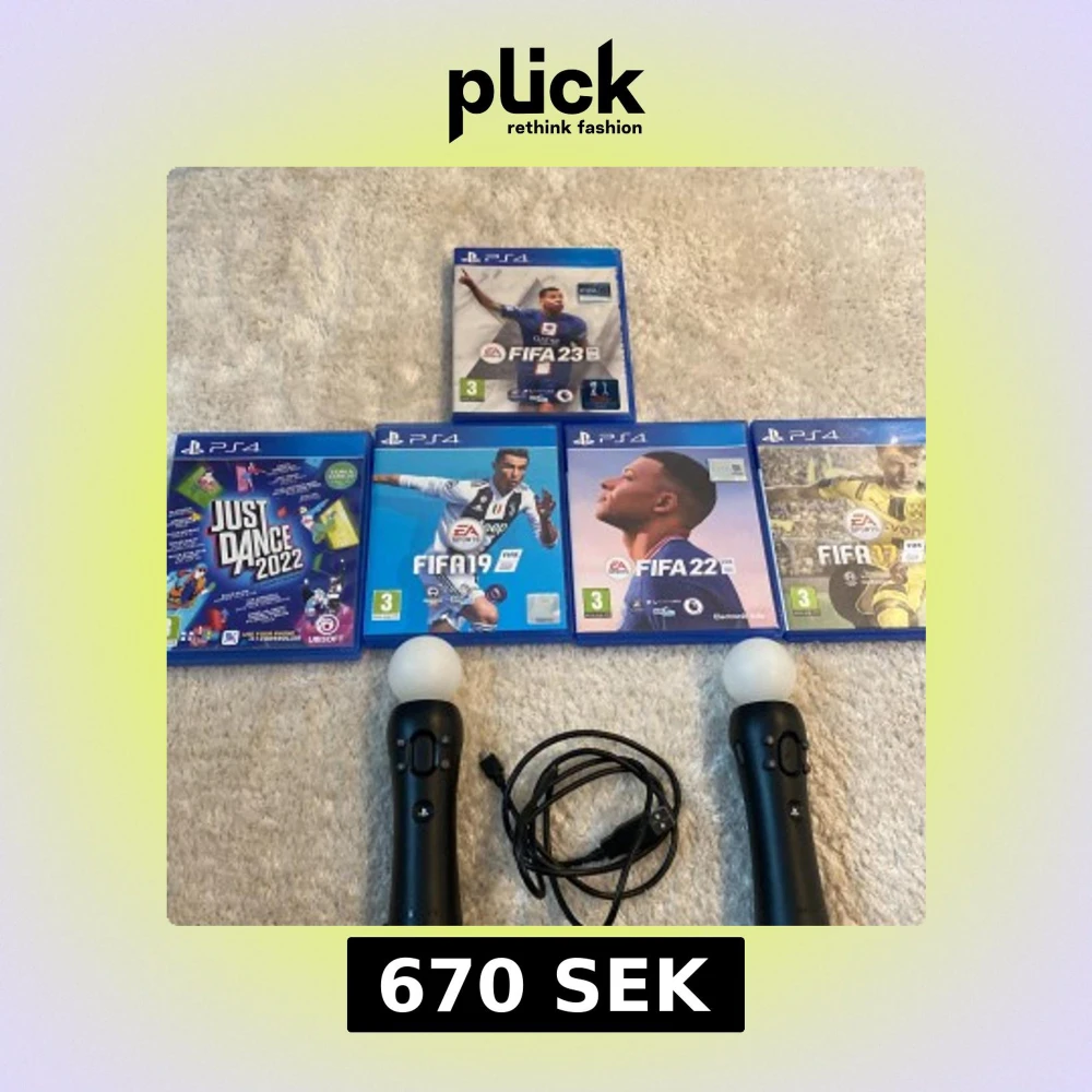 Säljer ett paket med PS4-spel inklusive FIFA 17, FIFA 19, FIFA 22, FIFA 23 och Just Dance 2022. Inkluderar även två PS Move-kontroller och en laddningskabel. Perfekt för spelkvällar med vänner eller familj!