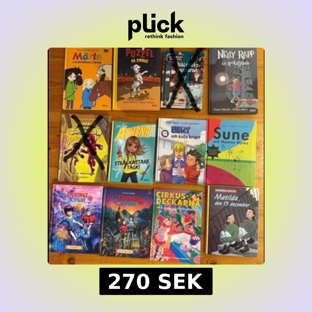 En samling av 10 olika ungdomsböcker med titlar som 'Märta och stallkompisarna', 'Puzzel på cirkus', 'Nelly Rapp och spökaffären', 'Athena: Strålkastare tack!', 'Sune och Mamma Mysko', 'Cirkusdeckarna', Karma och Jonar och fler. Perfekt för unga läsare som gillar äventyr och mysterier.