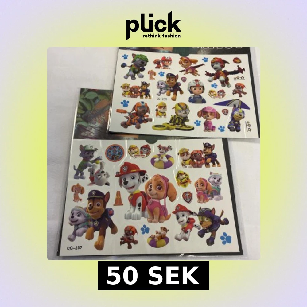 Säljer ett set med färgglada tatueringar med karaktärer från Paw Patrol. Perfekt för att dekorera anteckningsböcker, laptops eller andra ytor. Innehåller flera olika karaktärer i olika poser och storlekar. 50kr/2st / bild