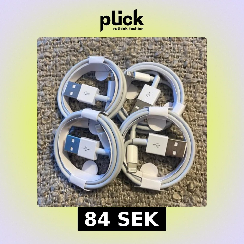 Säljer fyra vita USB till Lightning-kablar. Perfekta för att ladda din iPhone eller iPad. Kablarna är snyggt ihoprullade och redo att användas. Passar alla enheter med Lightning-port.