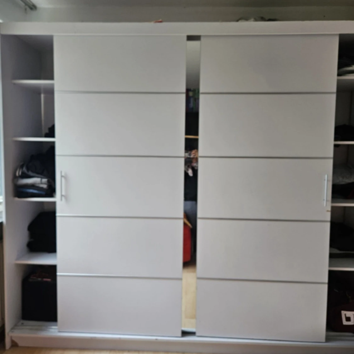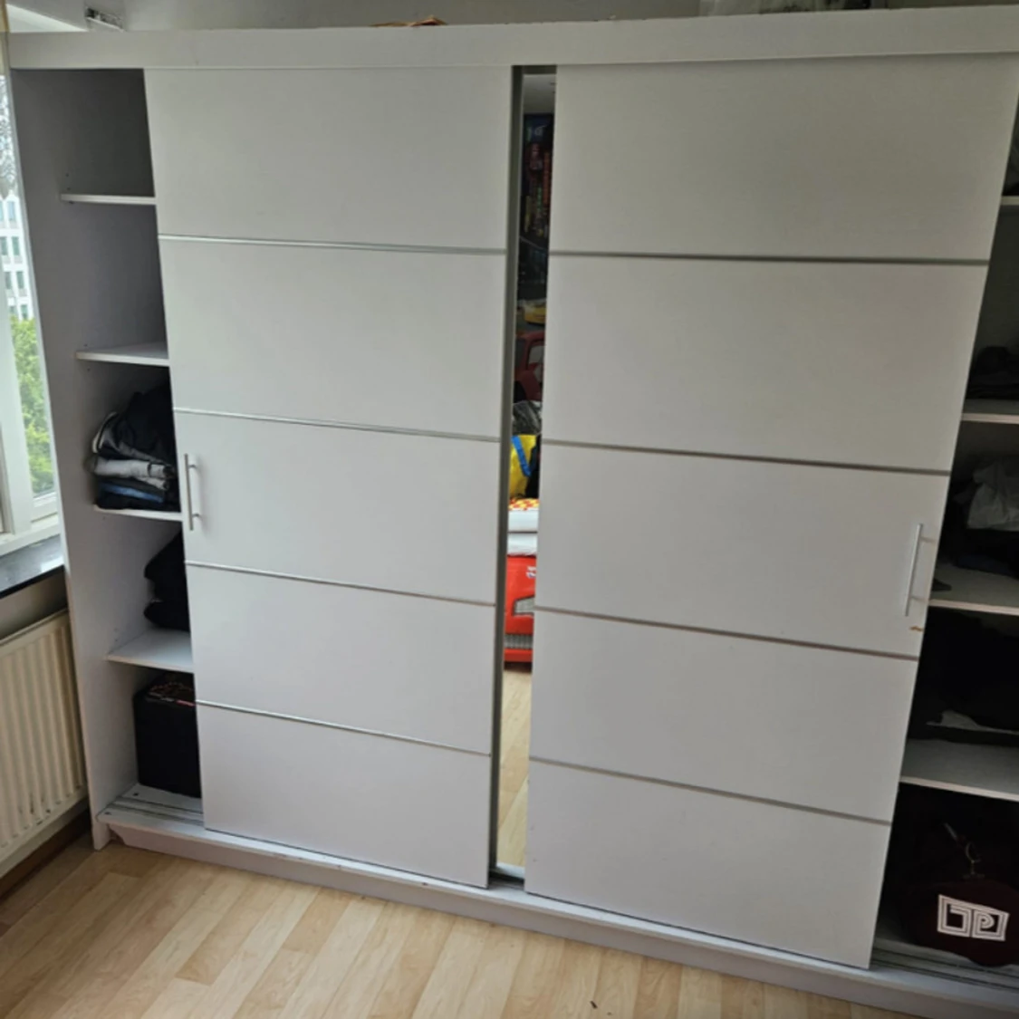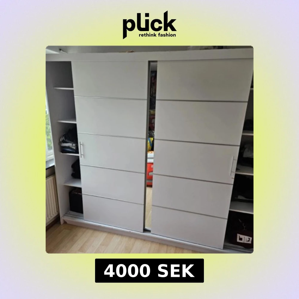 Bilderna visar en stor vit garderob med skjutdörrar och flera hyllor fyllda med kläder. Ingen bok syns på bilderna. Man kan ej hitta samma garderob för 4000 alla andra kostar 10-15 tusen för mindre pris kontakta 0763181323