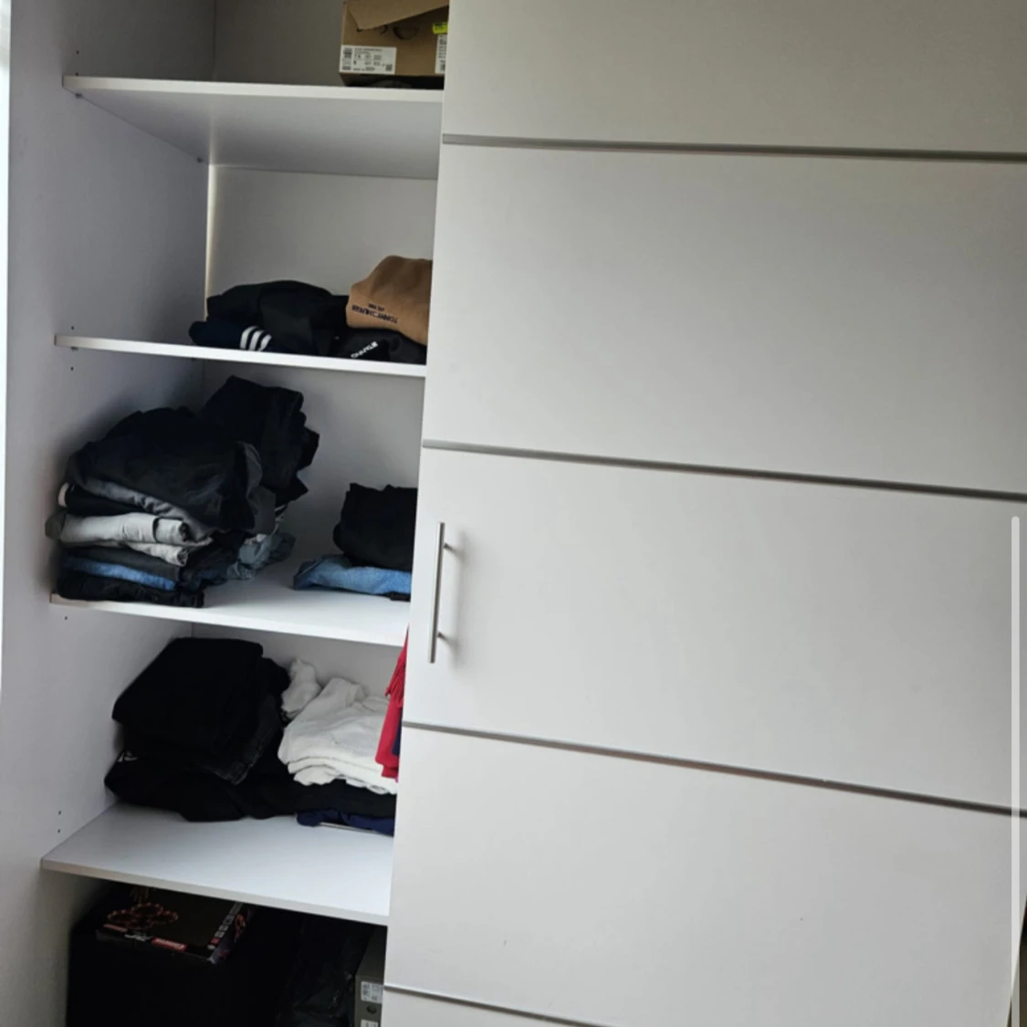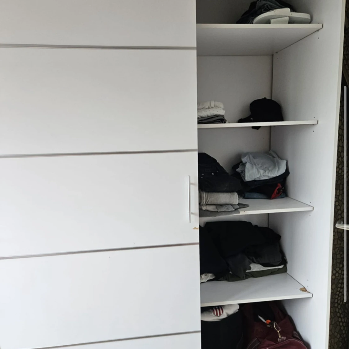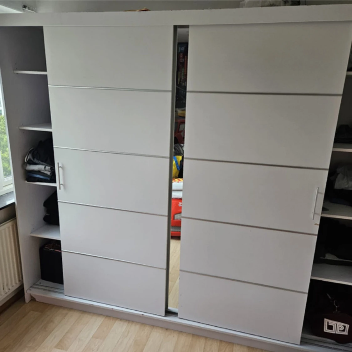Bilderna visar en stor vit garderob med skjutdörrar och flera hyllor fyllda med kläder. Ingen bok syns på bilderna. Man kan ej hitta samma garderob för 4000 alla andra kostar 10-15 tusen för mindre pris kontakta 0763181323