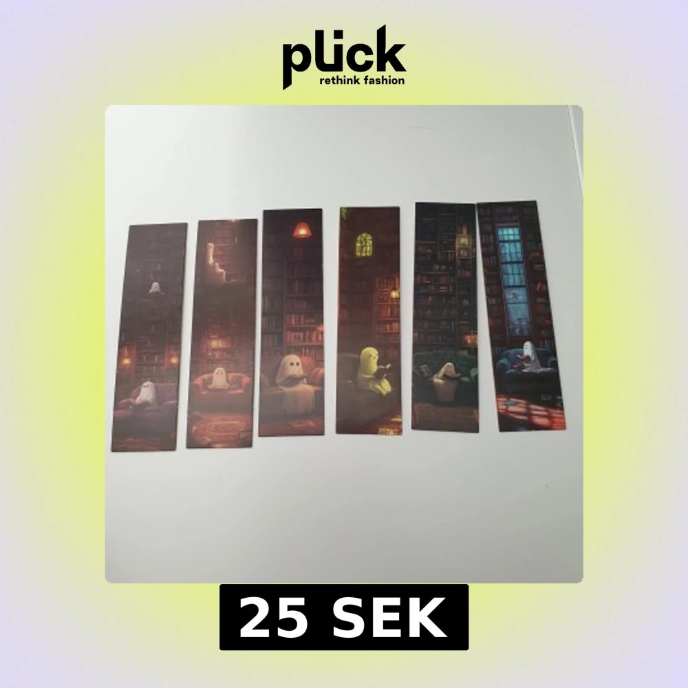 Ett set med sex bokmärken som visar söta spöken som läser böcker i mysiga biblioteksmiljöer. Perfekt för dig som älskar böcker, fantasy och vill ha en unik touch till din läsning. Passar både ungdomar och unga vuxna som vill göra läsningen lite roligare. Skick: oanvända, men verkar som färger har gått över lite från ena bokmärken till den andra baksida. Så är lite fläckigt.