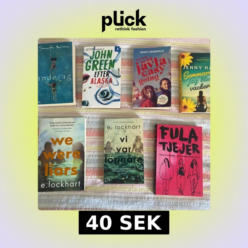 Säljer ett paket med sju ungdomsböcker på svenska och engelska. Bland titlarna finns 'Andetag', 'Efter Alaska', 'Vi var lögnare' på svenska, 'Fula tjejer', 'Sommaren jag blev vacker' och 'Jag är ju så jävla easy going'. Perfekt för dig som gillar spännande och känslosamma berättelser. Billigare vid köp av fler🥰🥰40kr för 1. We were liars e borta!!
