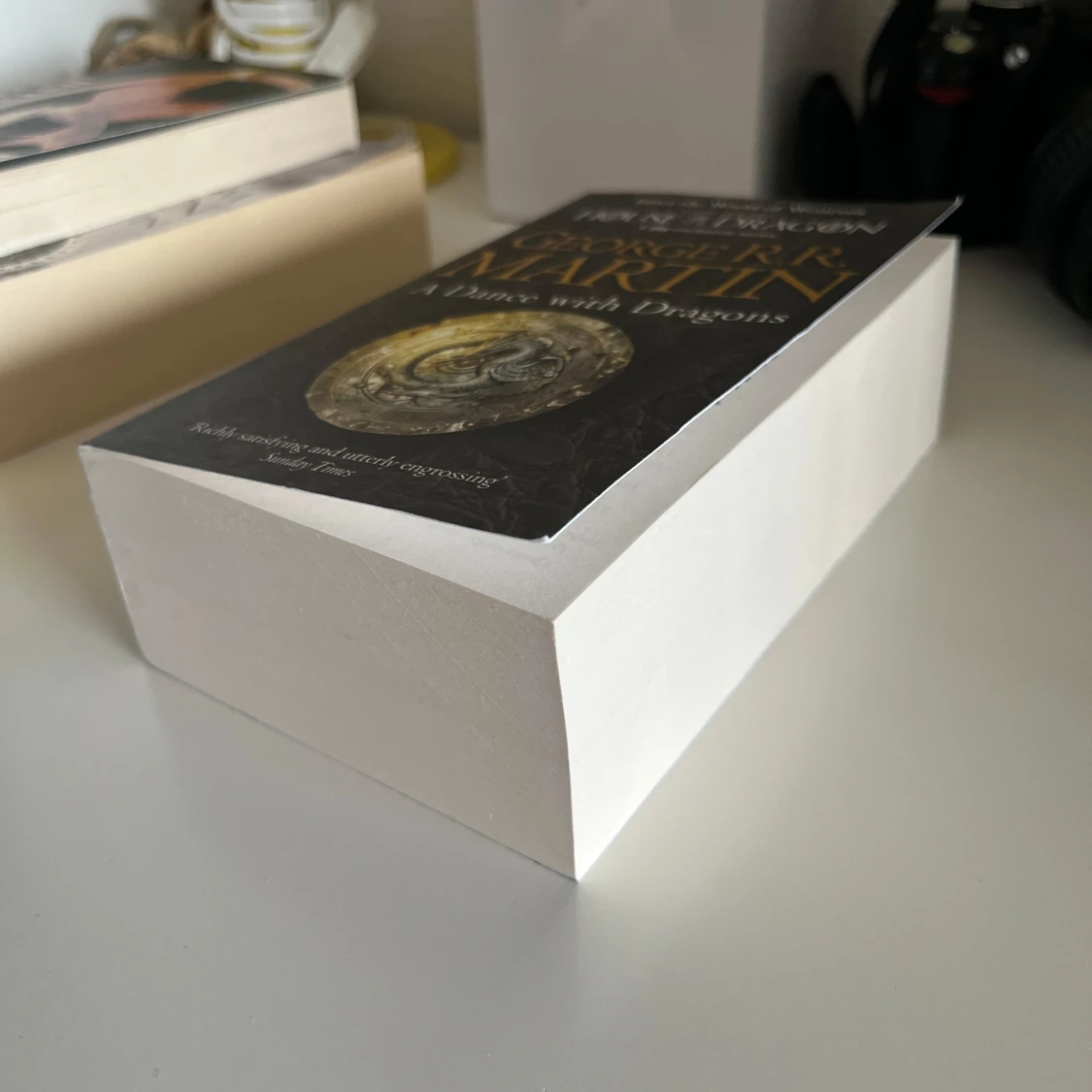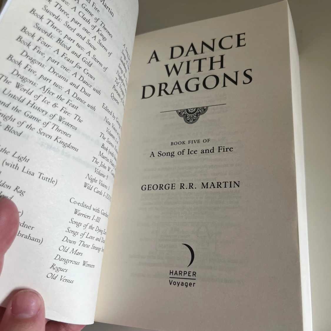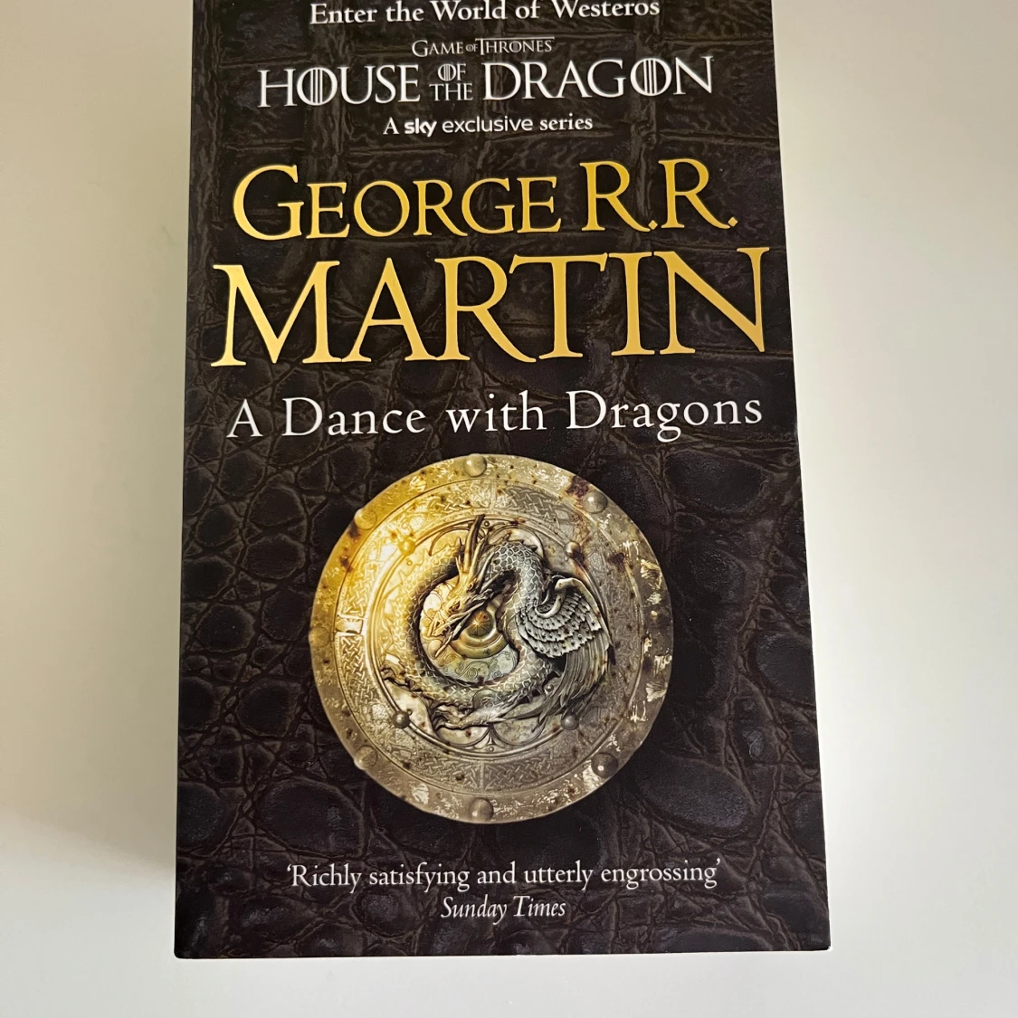 A Dance with Dragons, engelsk utgåva, är GRRM sista bok (än så länge) av hans bokserie. Den är spännande men rekommenderas läsas av en äldre ungdom då den kan innehålla grova handlingar!