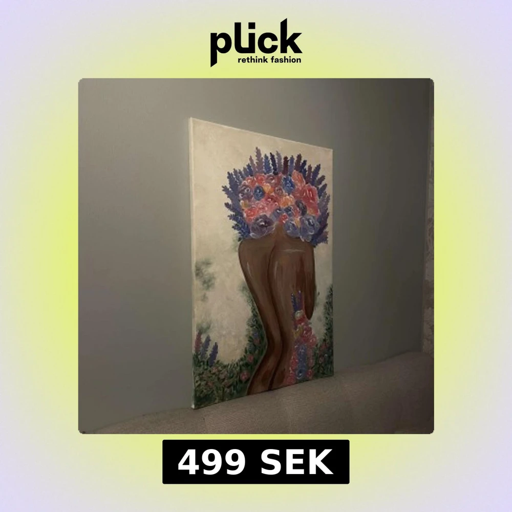 ”Bland blommor (ver 2)” Denna tavla föreställer en stiliserad mänsklig siluett, där huvudet och håret har ersatts av en överdådig bukett blommor i starka färger – lila, rött, blått och gult. Formen på kroppen är varm och mjuk, medan bakgrunden hålls ljus och drömlik, vilket låter färgerna explodera i fokus. Mått:60 x 40. Målad av mig! Skriv vid intresse!