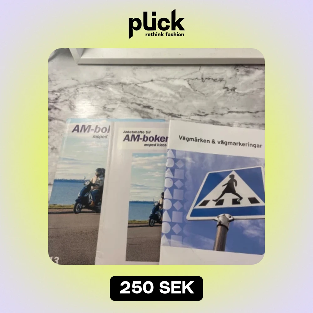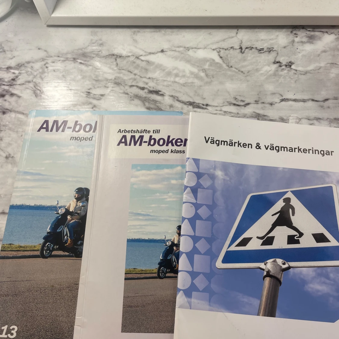 säljer läroböcker till Am körkort. Textbok, arbetshäfte och vägmärken häfte. Tecken på användning men går att använda som vanligt. har skrivit i arbetshäftet med blyertspenna så de går att sudda💕