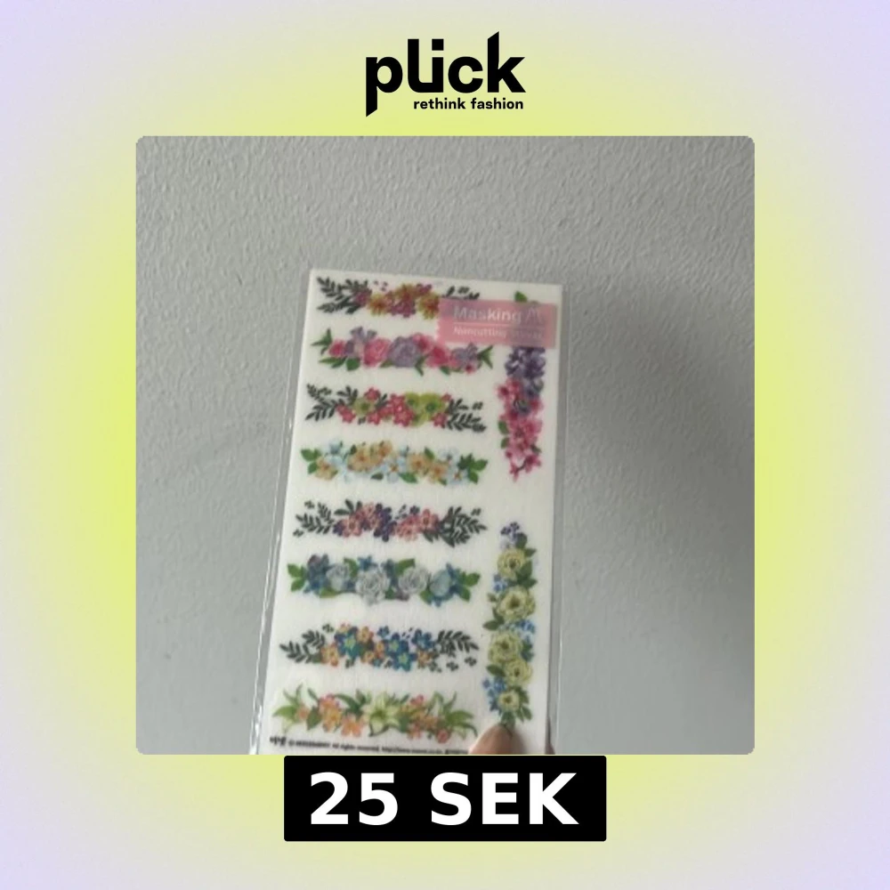 Ett ark med vackra blommiga maskeringstejp klistermärken i olika färger och mönster. Perfekt för att dekorera anteckningsböcker, kort eller andra kreativa projekt. Klistermärkena har motiv av blommor i rosa, lila, blått och grönt.