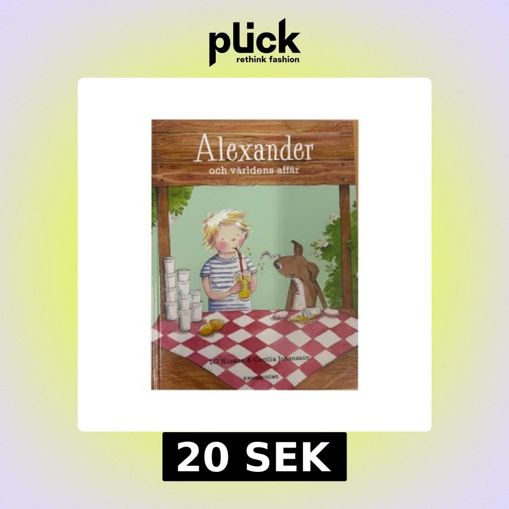 En charmig barnbok om Alexander och hans äventyr vid världens affär. Boken har en färgglad framsida med illustrationer av Alexander och en hund vid ett bord med rutig duk. Perfekt för unga läsare som älskar äventyr och vänskap.