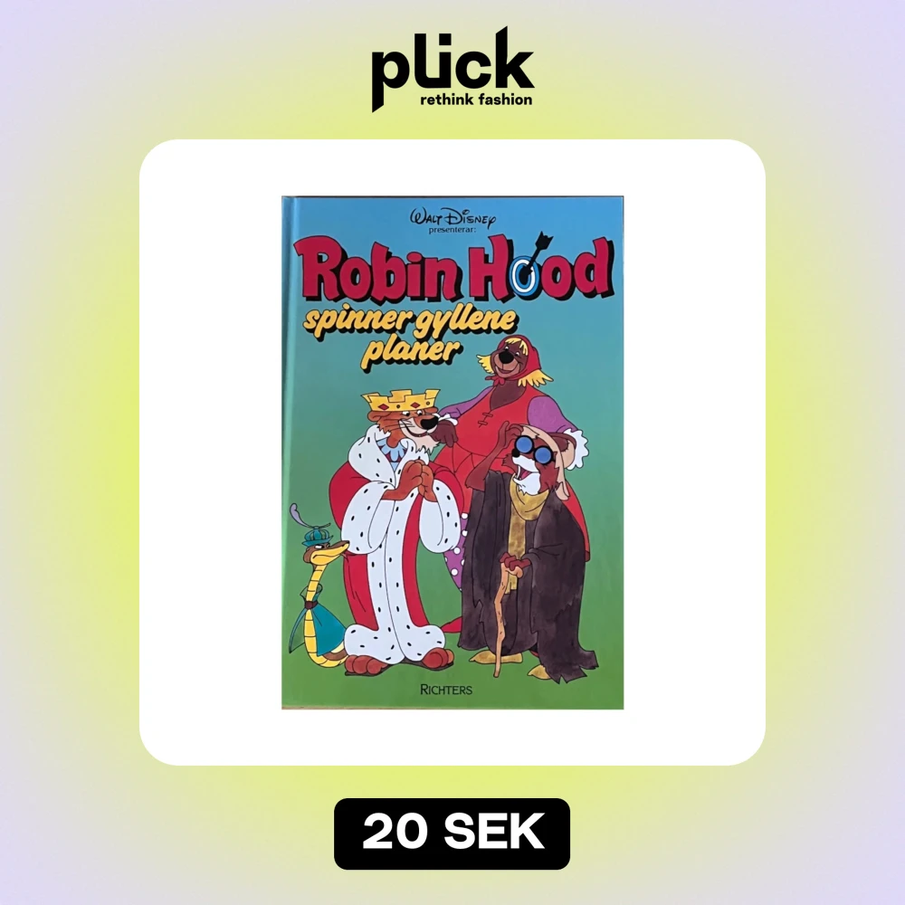 En färgglad bok från Walt Disney med titeln 'Robin Hood spinner gyllene planer'. Omslaget visar tecknade karaktärer från Robin Hood i glada färger. Perfekt för Disney-fans och samlare!