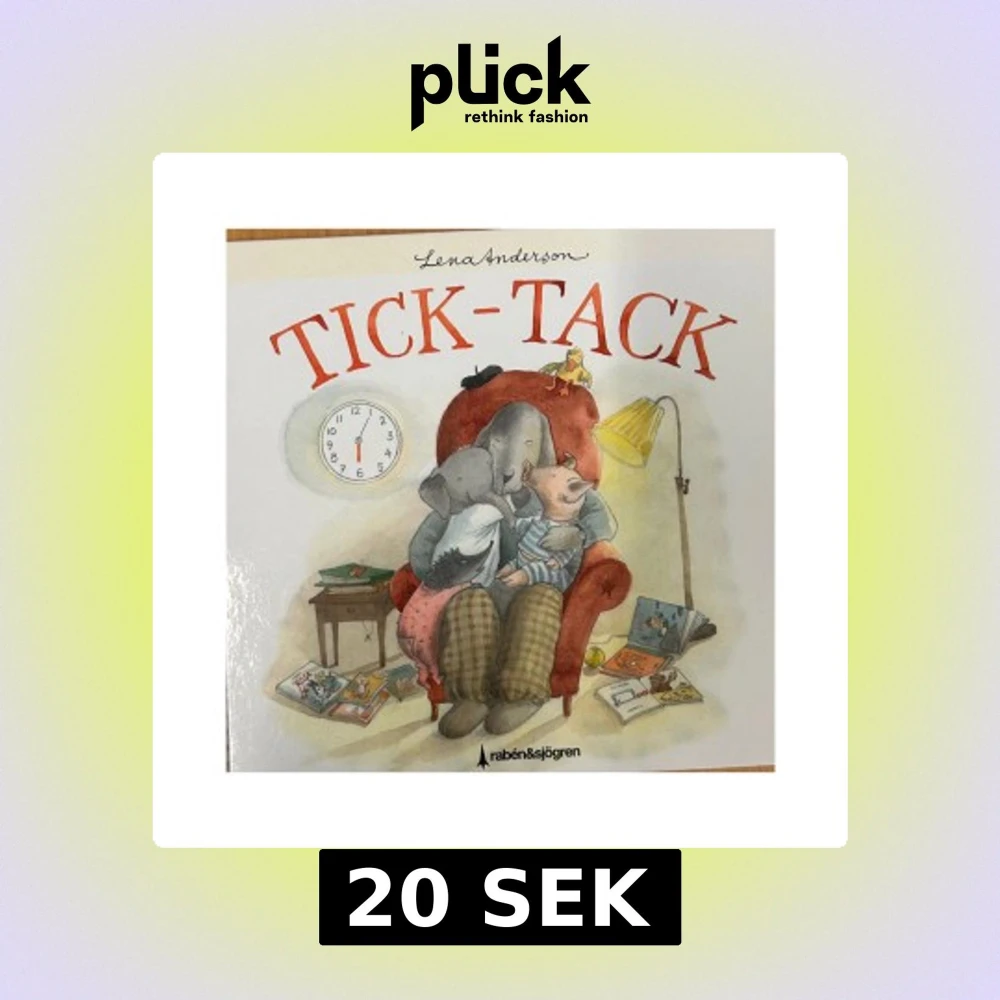Charmig barnbok av Lena Anderson med titeln 'Tick-Tack'. Omslaget visar en mysig illustration av två elefanter i en fåtölj omgivna av böcker och en klocka. Perfekt för högläsning och att upptäcka tillsammans med barn.