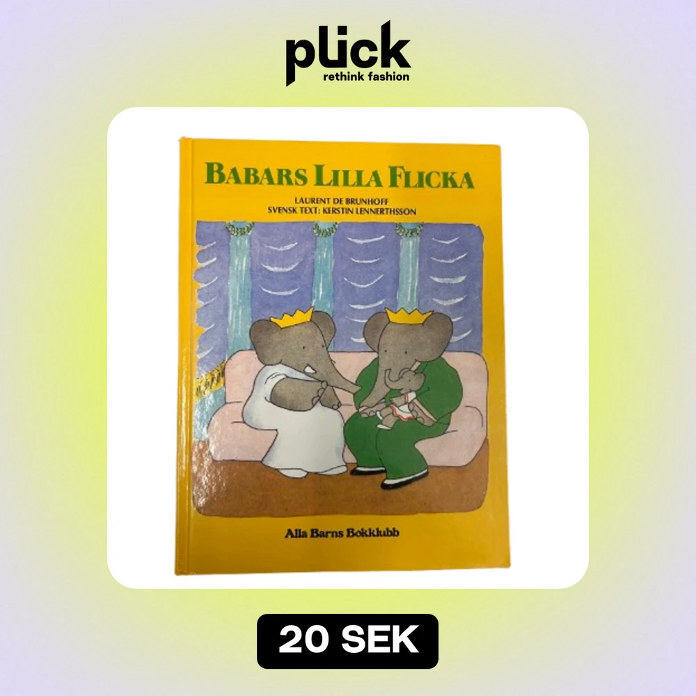 En charmig barnbok med titeln 'Babars Lilla Flicka' av Laurent de Brunhoff. Boken har en gul omslag med en illustration av elefanter i kungliga kläder. Svensk text av Kerstin Lennerthson. Perfekt för barn som älskar berättelser om djur och kungligheter.