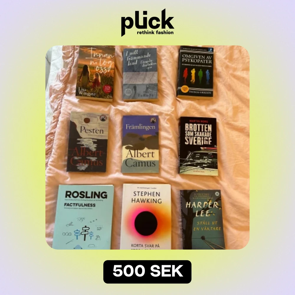 60kr/styck ej frakt 1. Innan ni tog oss 2. I mitt främmande land 3. Omgiven av psykopater 4. Pesten 5. Främlingen 6. Brotten som skakade Sverige 7. Factfulness 8. Korta svar på stora frågor 9. Ställ ut en väktare Alla: 500kr ej frakt