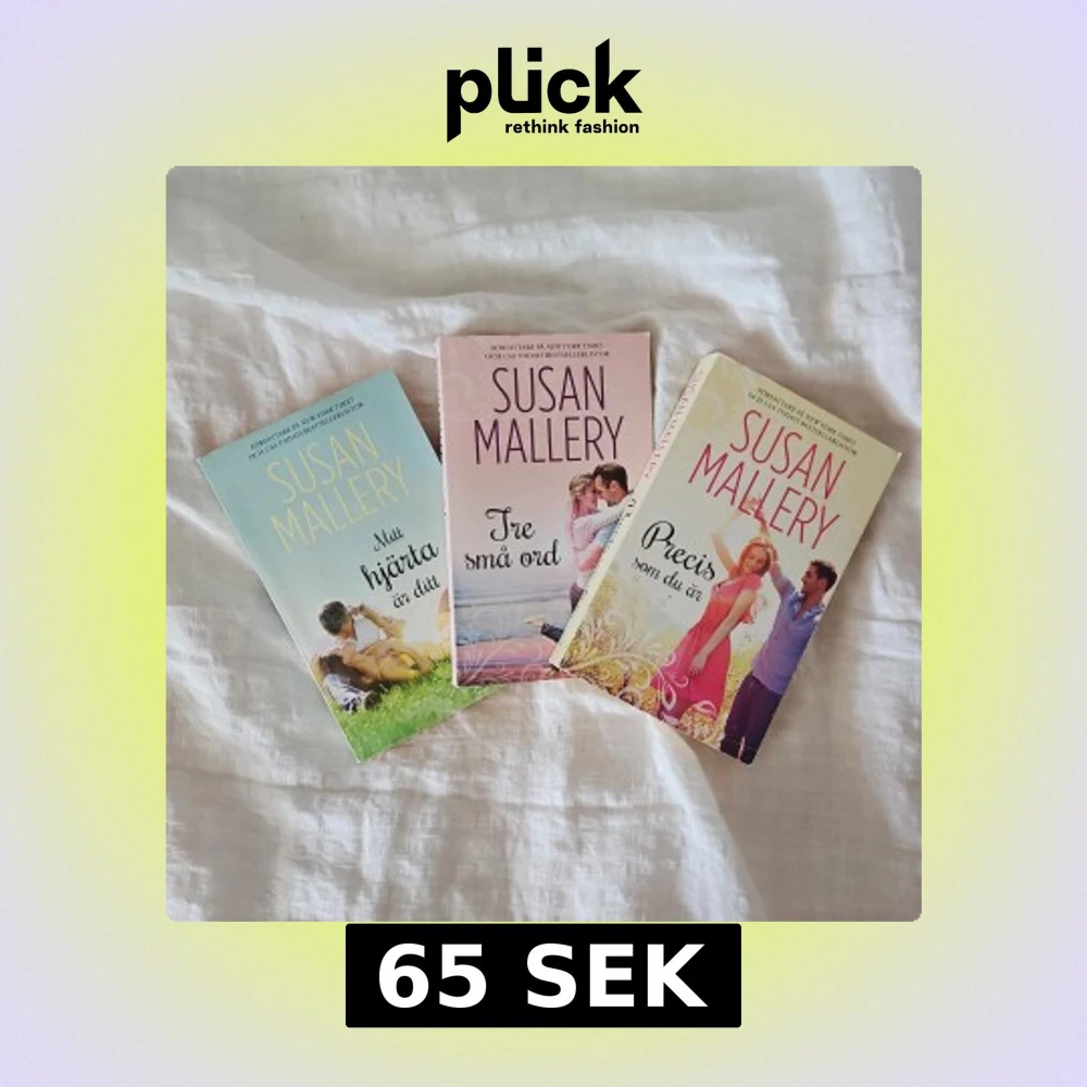 Tre romantiska pocketböcker av Susan Mallery: 'Ditt hjärta är ditt', 'Tre små ord' och 'Precis som du är'. Omslagen har mjuka pastellfärger och motiv med par i olika miljöer. Perfekt för dig som gillar feelgood och kärleksromaner.