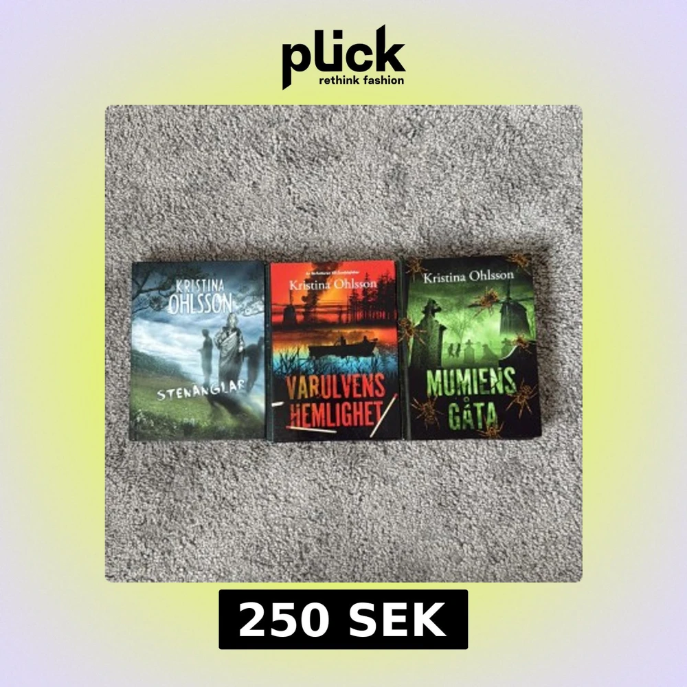 Tre spännande böcker av Kristina Ohlsson med mystiska och övernaturliga teman. Perfekt för dig som gillar äventyr, gåtor och lite ryslig stämning! Omslagen lockar med statyer, varulvar och mumier – en riktig bladvändartrio för unga läsare. Säljer alla dessa böcker för 250 kr, perfekt för yngre läsintresserade.