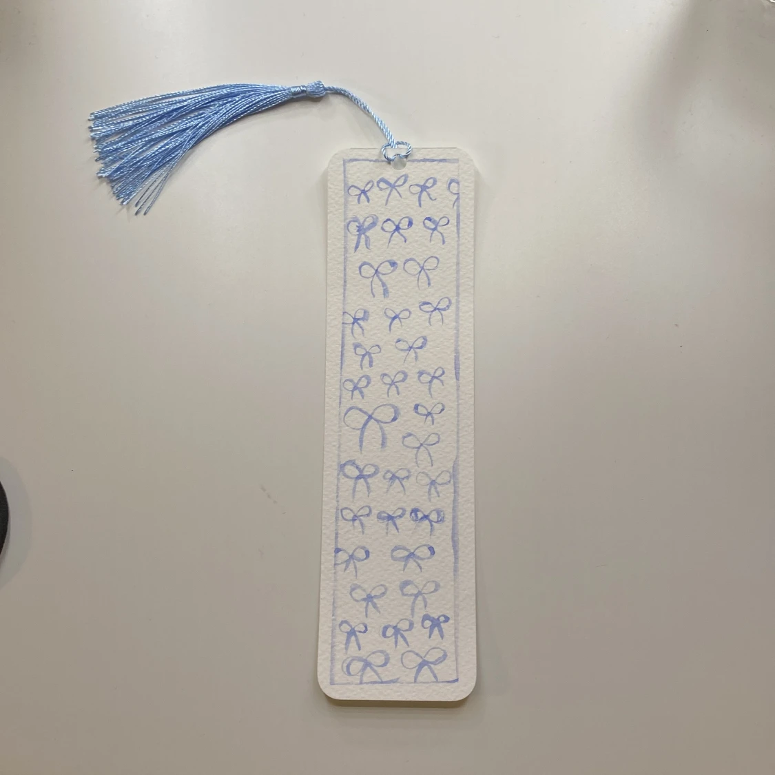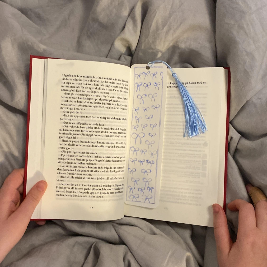 Charmigt bokmärke dekorerat med små blå rosetter och en matchande blå tofs. Perfekt för att hålla koll på var du är i din bok. Tillverkad i ett lätt och hållbart material. Tofsen går även att byta färg på om så önskas!