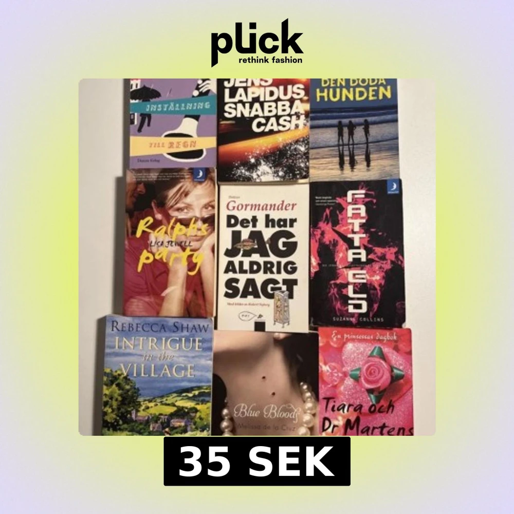 34 kr för alla tillsammans!! Ett paket med nio olika böcker i varierande genrer. Inkluderar titlar som 'Inställning till regn', 'Snabba Cash', 'Den döda hunden', 'Ralphs party', 'Det har jag aldrig sagt', 'Fatta eld', 'Intrigue in the Village', 'Blue Bloods' och 'Tiara och Dr Martens'. Perfekt för bokälskare som vill ha en mix av spänning, drama och romantik.