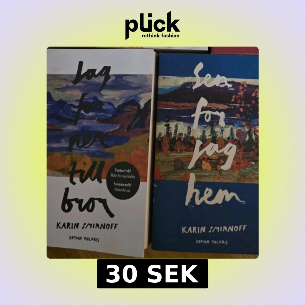En samling av tre böcker av Karin Smirnoff: 'Jag for ner till bror', 'Sen for jag hem', och 'Vi for upp med mor'. Böckerna har färgglada omslag med konstnärliga motiv och handskriven text. Perfekt för den som gillar svensk samtidslitteratur.