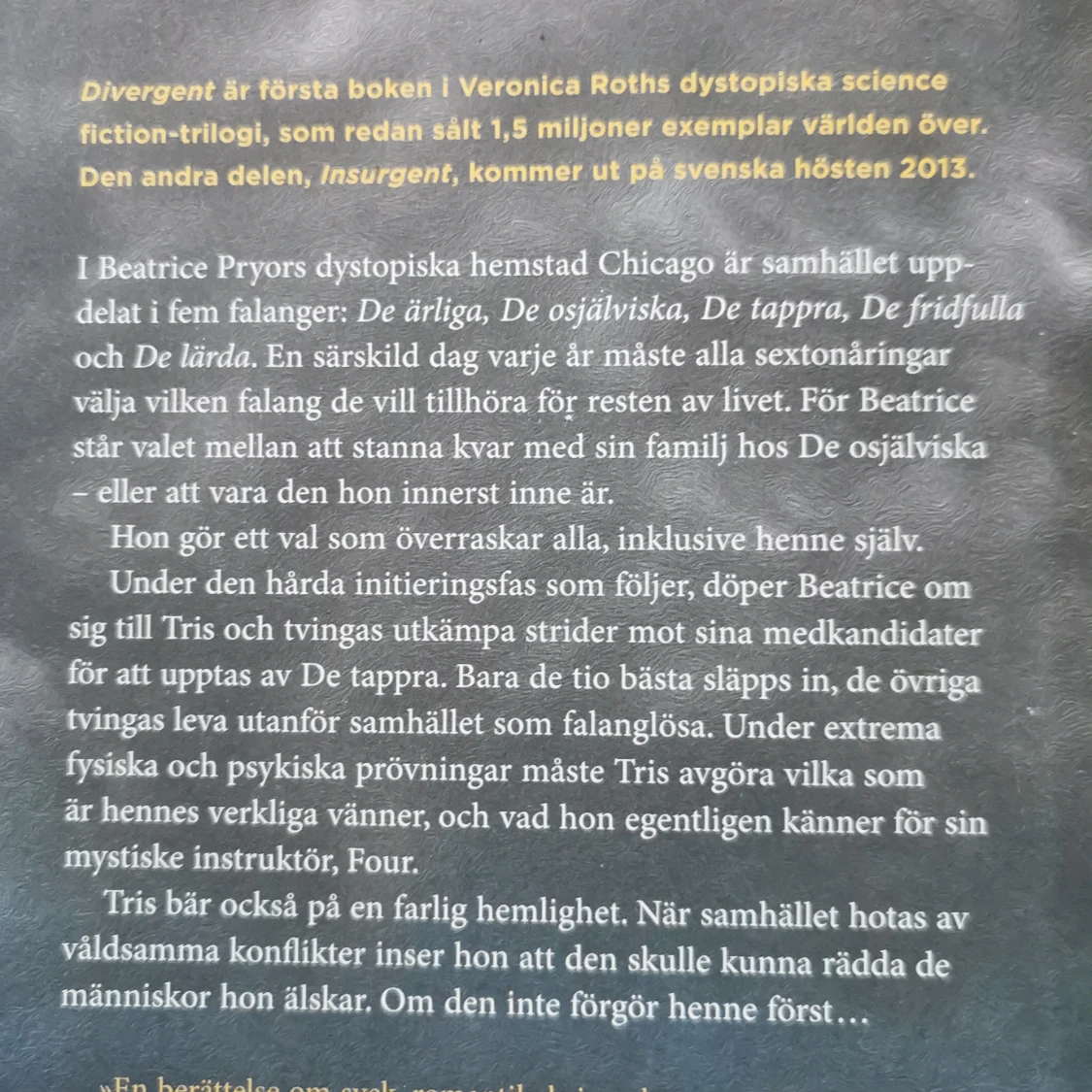 Divergent av Veronica Roth i den populära serien Divergent. Boken är en hardcover och är lite använd.