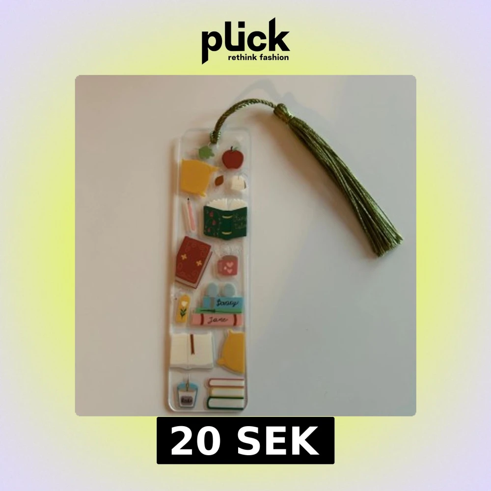 Ett snyggt bokmärke i akryl med grönt tofsband och färgglada illustrationer av böcker, muggar, ljus och kuddar. Perfekt för dig som älskar att läsa och vill ha en personlig touch till din läsupplevelse.
