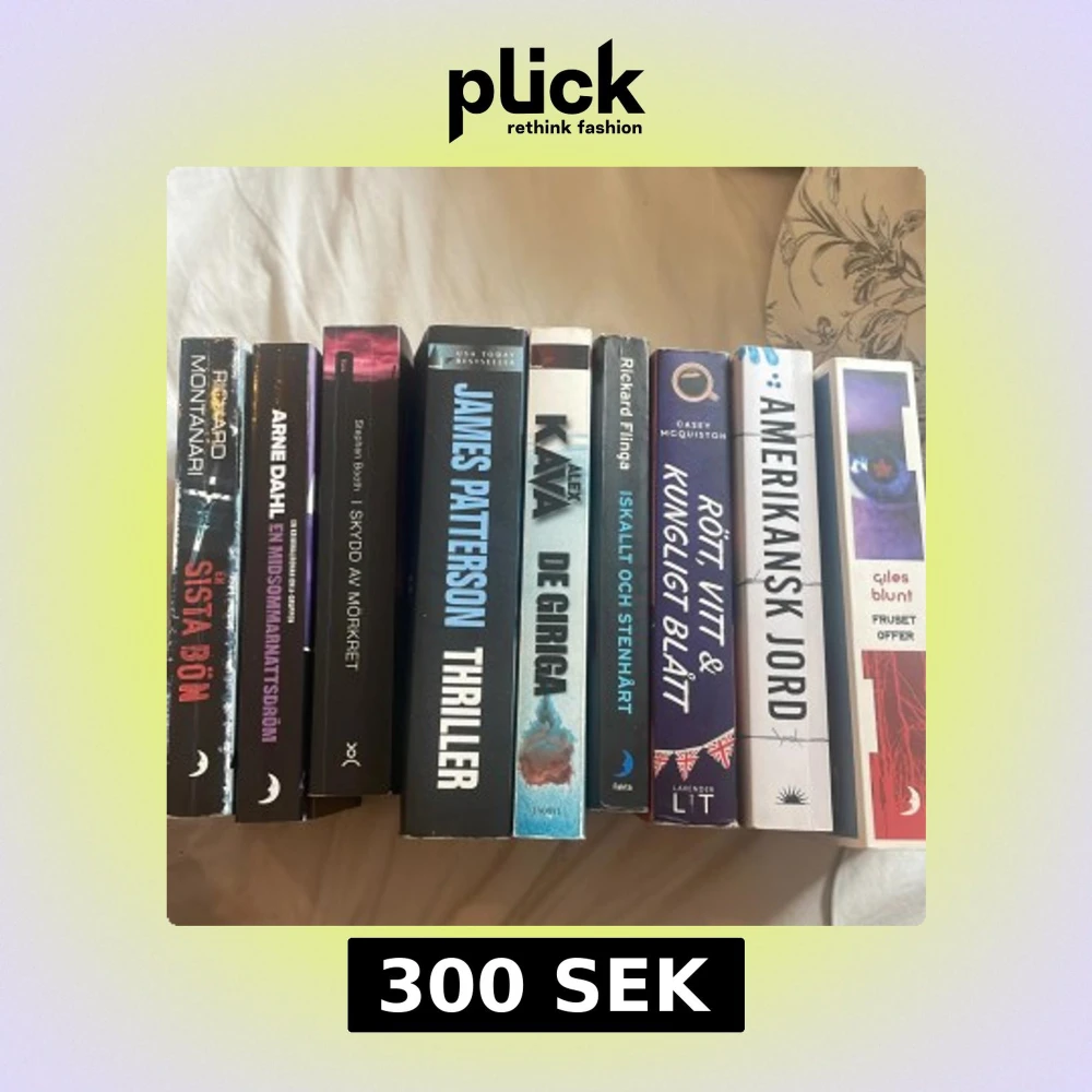 Massor av olika böcker bland annat thrillers, kriminalromaner och romanser. 50kr/styck eller alla för 300kr! Skriv privat om ni är intresserade av en speciell så kan jag skicka bild på baksidan :)