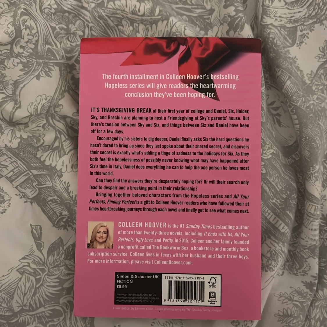 En gripande novella av Colleen Hoover, perfekt för unga vuxna! Följ karaktärerna från Hopeless-serien när de samlas under Thanksgiving och ställs inför känslomässiga utmaningar, hemligheter och relationer. En hjärtevärmande bok om vänskap, kärlek och att hitta sig själv.