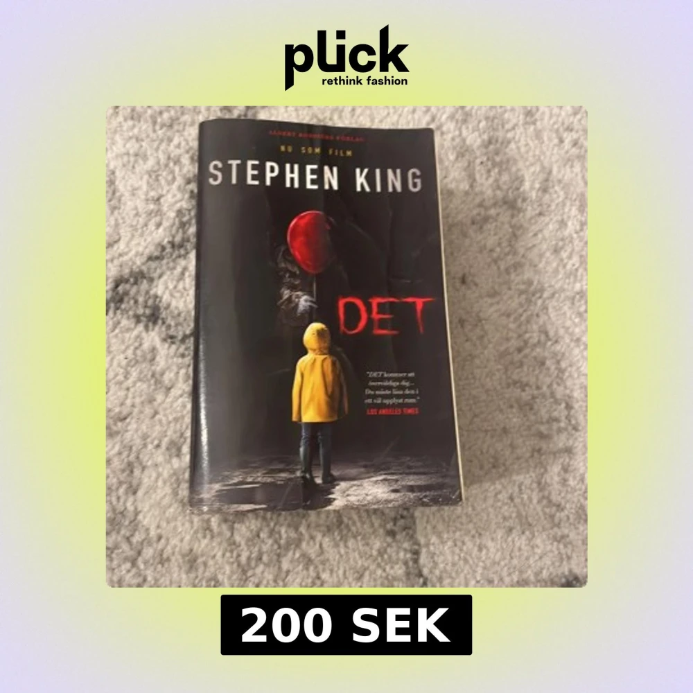 En skrämmande och spännande bok av Stephen King. Omslaget visar en person i gul regnjacka och en röd ballong, vilket ger en mystisk och kuslig känsla. Perfekt för dig som gillar rysare och vill ha en bok som håller dig på helspänn.