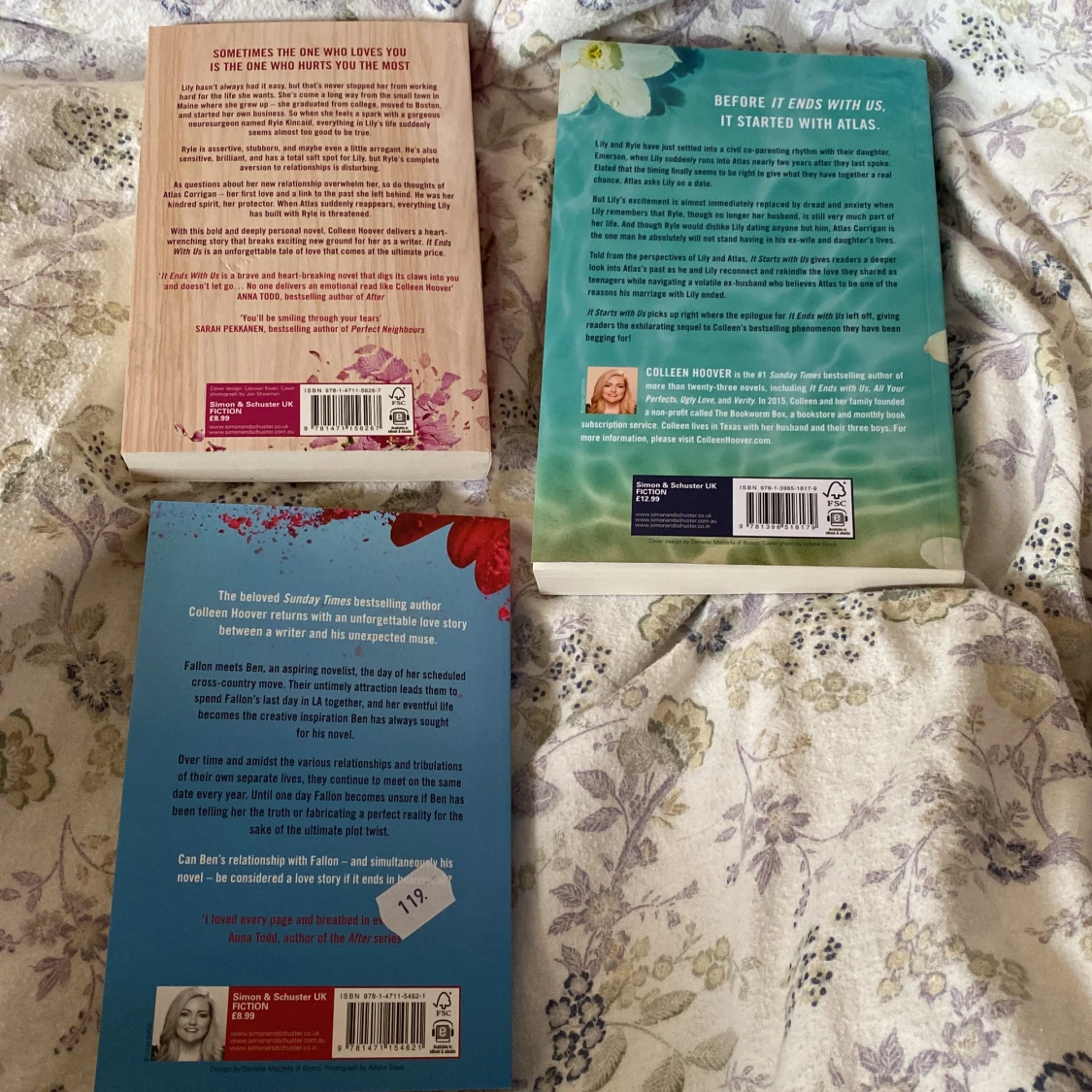 Säljer böckerna It ends with us, It starts with us och November 9 av Colleen Hoover. Har läst It ends av oss en gång, dem andra har stått orörda i bokhyllan. Fint skick! Bara It ends with us som har ett märke, men det var så när jag köpte den.