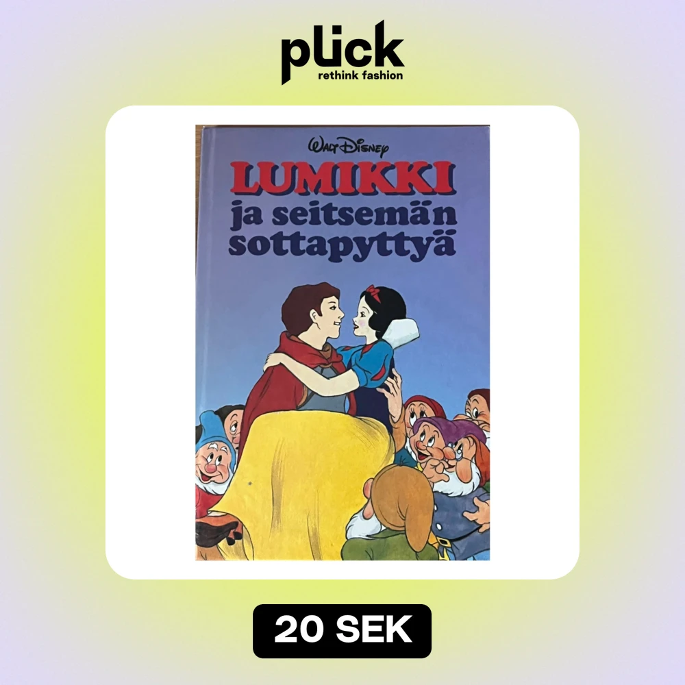 En bok med titeln 'Lumikki ja seitsemän sottapyttyä' från Walt Disney. Omslaget visar Snövit omgiven av de sju dvärgarna. Boken har en blå bakgrund med stora röda bokstäver för titeln.