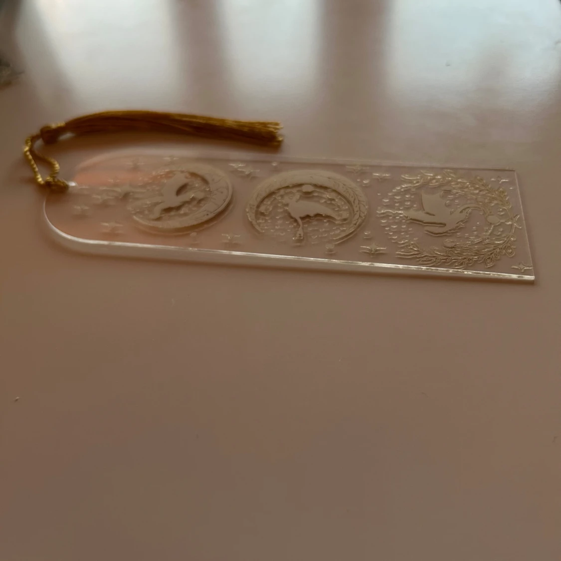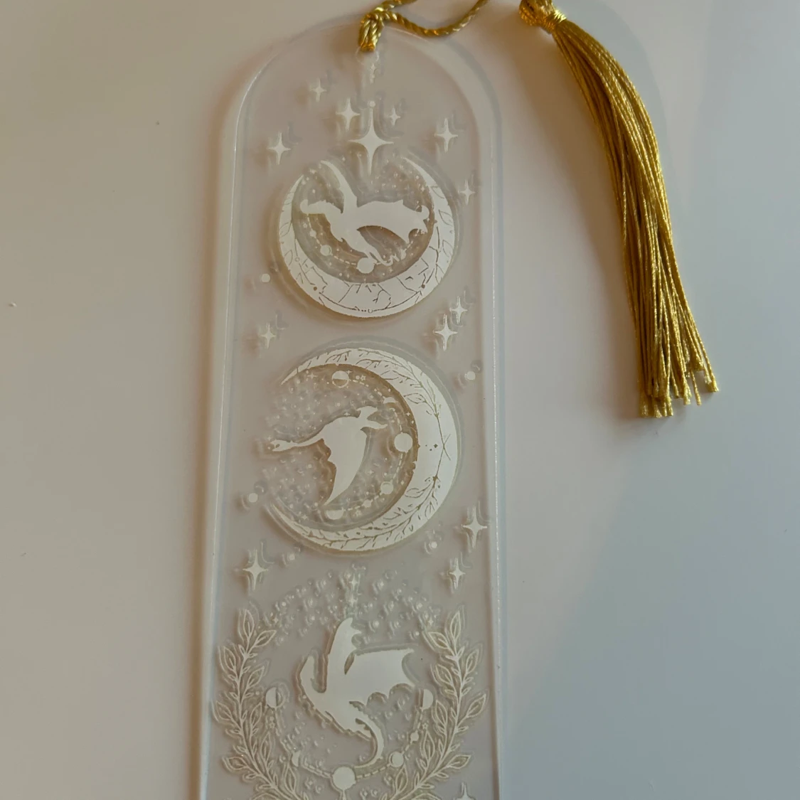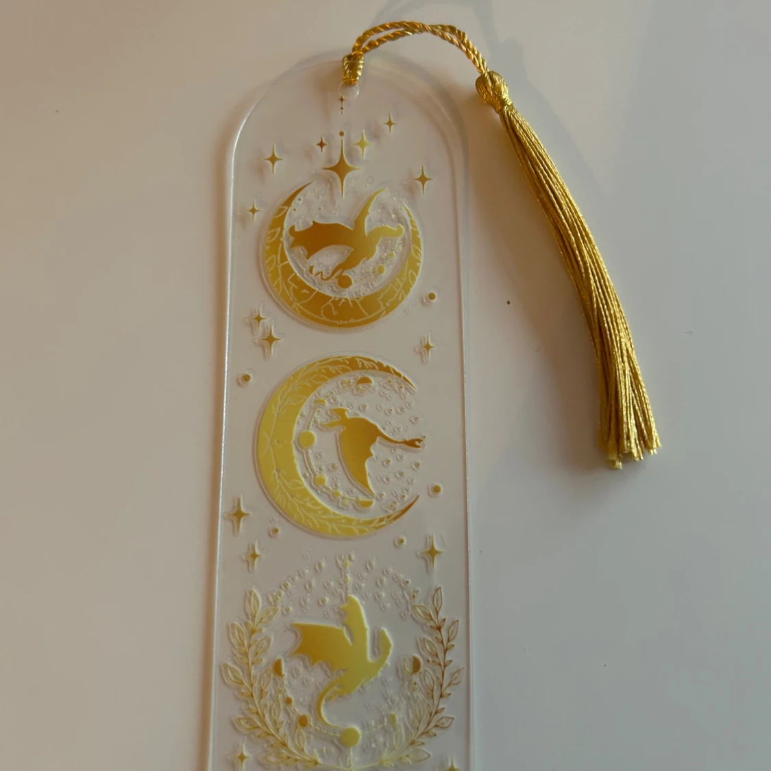 Fourth Wing bokmärke med gyllene motiv av drakar och månar, perfekt för fantasyälskare. Med sin eleganta tofs och magiska design blir det en snygg accessoar till din favoritbok. Passar dig som vill göra läsningen lite mer episk och unik. Akryl.