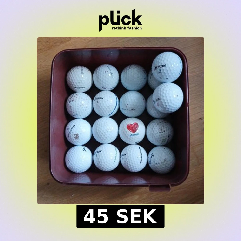 Säljer en samling vita golfbollar i en rödbrun plastlåda. En av bollarna har ett rött hjärta och texten 'Michele' på sig. Flera olika märken syns på bollarna, bland annat Srixon. Perfekt för golfentusiasten!